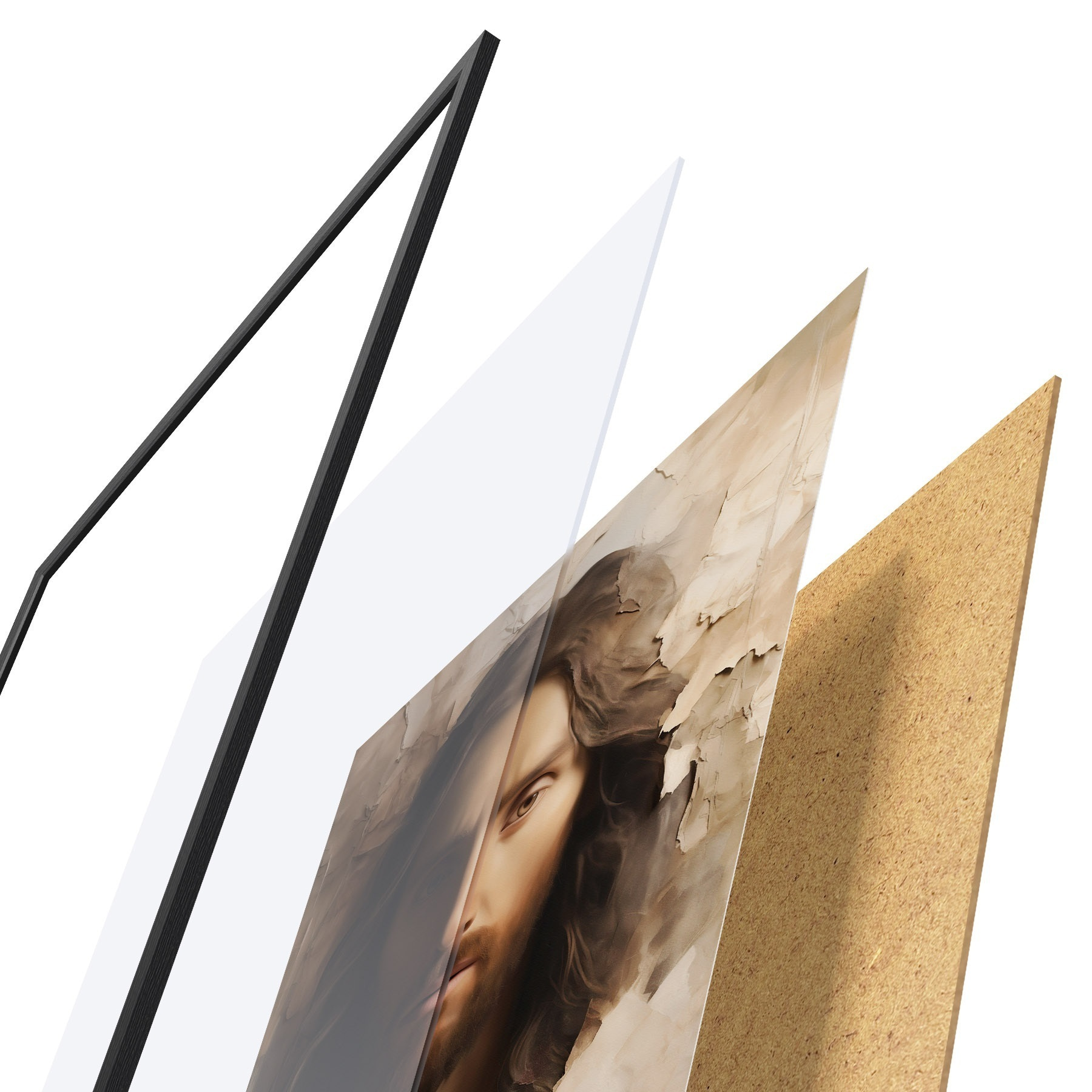 De poster bestaat uit een frame, plexiglas, geprinte afbeelding en spaanplaat achterkant. De poster kan meteen aan de muur worden gehangen dankzij de bevestigingen op de achterkant.