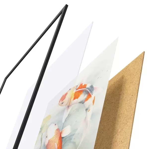 De poster bestaat uit een frame, plexiglas, geprinte afbeelding en spaanplaat achterkant. De poster kan meteen aan de muur worden gehangen dankzij de bevestigingen op de achterkant.