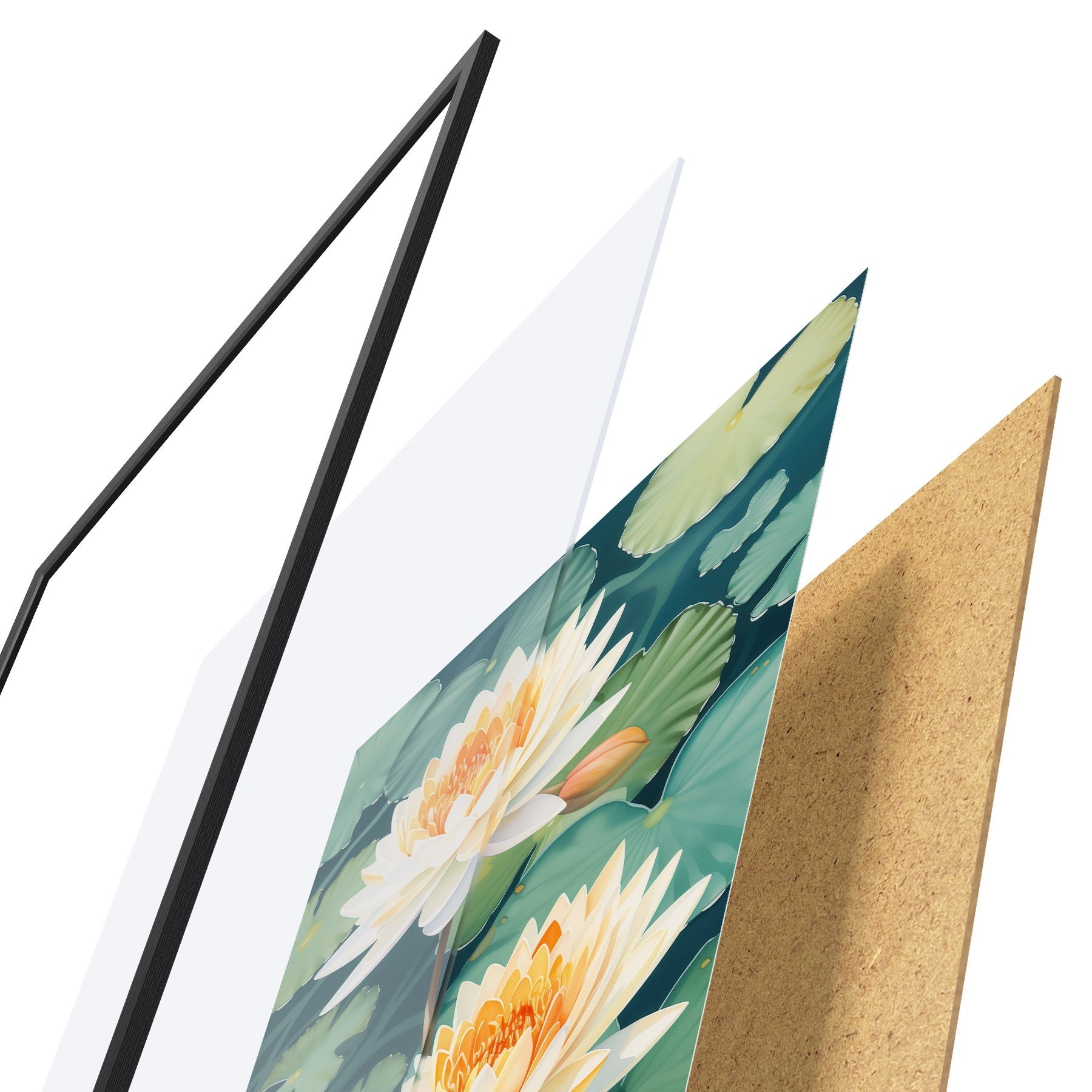 De poster bestaat uit een frame, plexiglas, geprinte afbeelding en spaanplaat achterkant. De poster kan meteen aan de muur worden gehangen dankzij de bevestigingen op de achterkant.