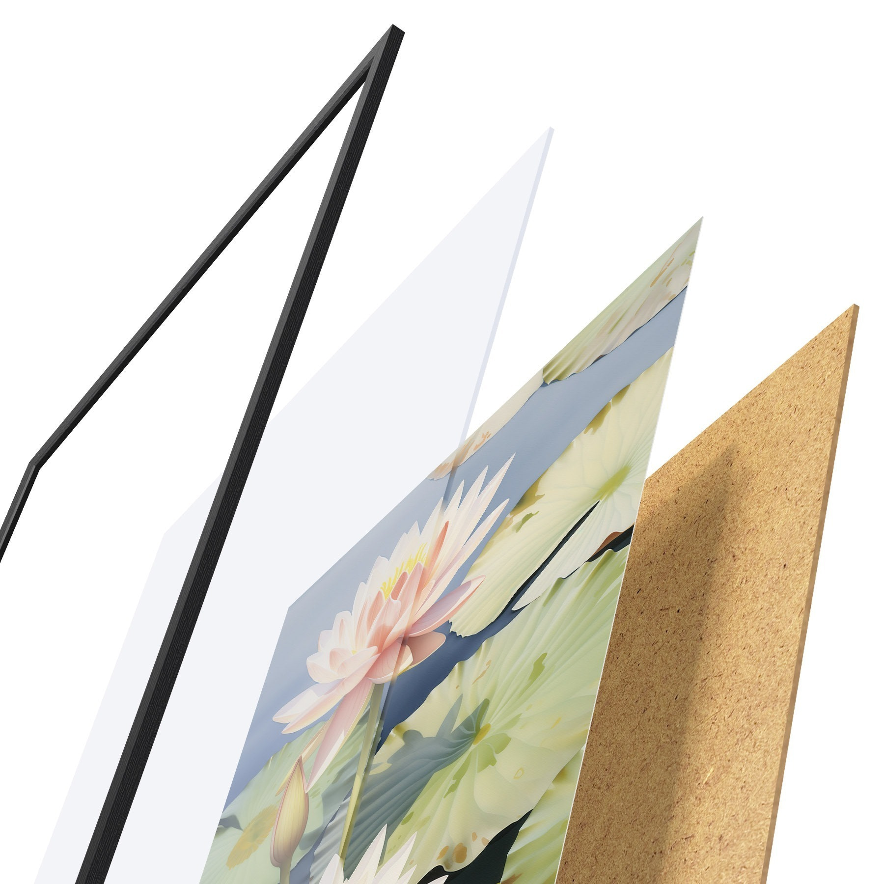 De poster bestaat uit een frame, plexiglas, geprinte afbeelding en spaanplaat achterkant. De poster kan meteen aan de muur worden gehangen dankzij de bevestigingen op de achterkant.