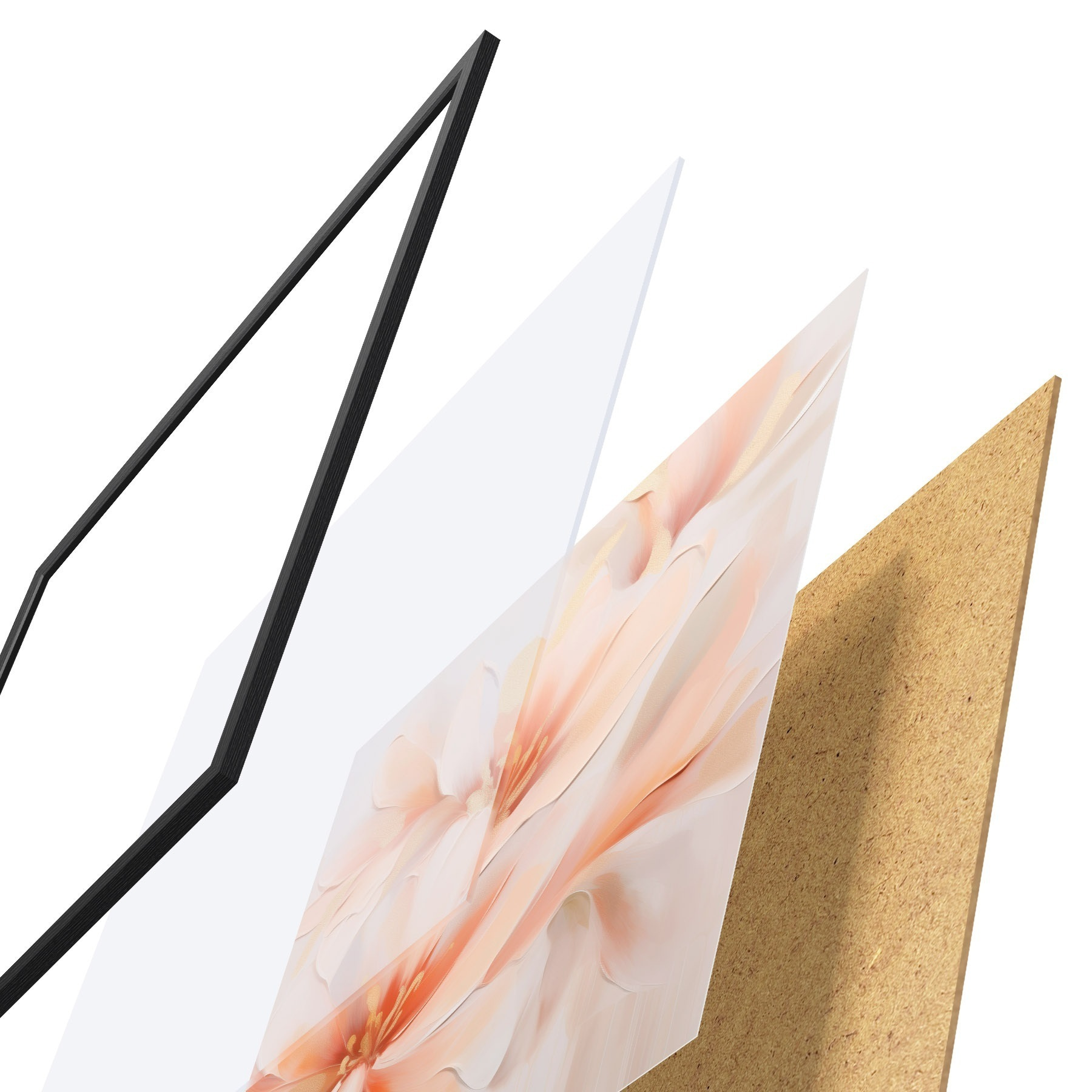 De poster bestaat uit een frame, plexiglas, geprinte afbeelding en spaanplaat achterkant. De poster kan meteen aan de muur worden gehangen dankzij de bevestigingen op de achterkant.