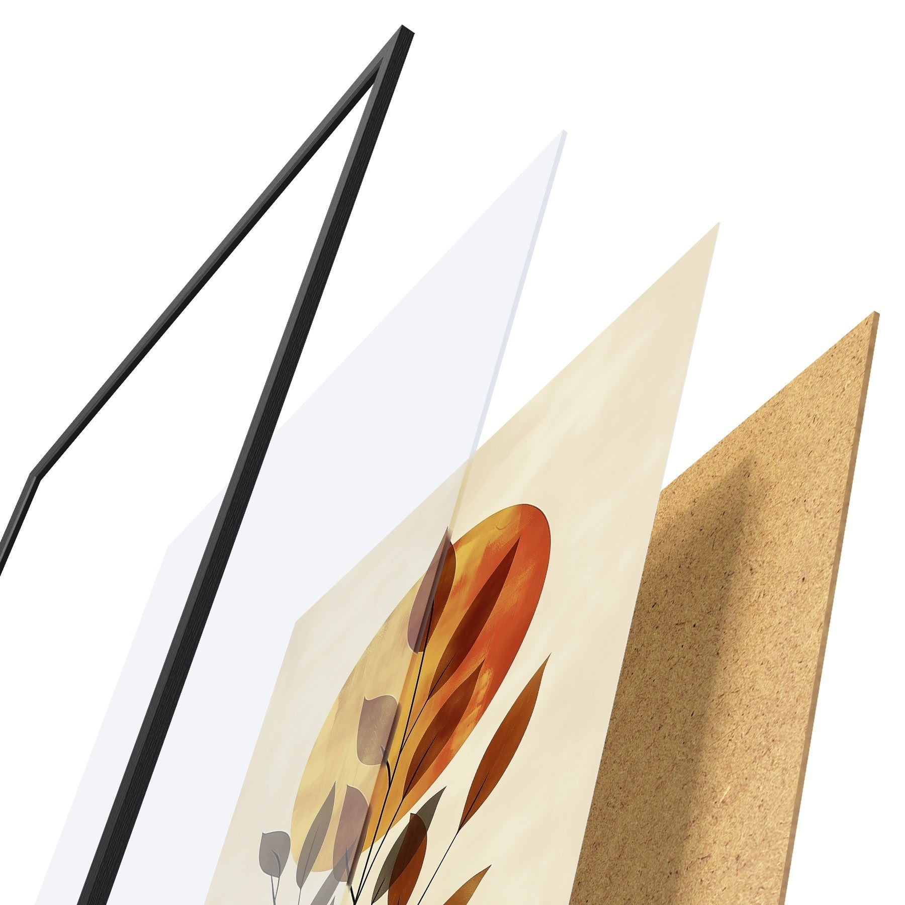 De poster bestaat uit een frame, plexiglas, geprinte afbeelding en spaanplaat achterkant. De poster kan meteen aan de muur worden gehangen dankzij de bevestigingen op de achterkant.
