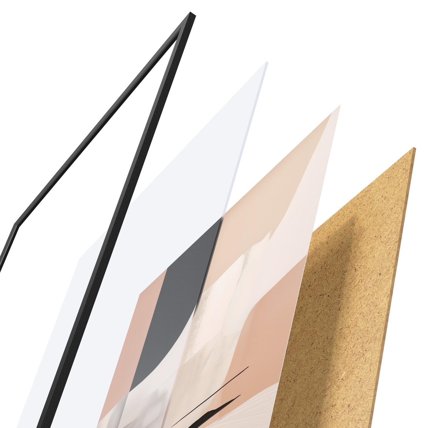 De poster bestaat uit een frame, plexiglas, geprinte afbeelding en spaanplaat achterkant. De poster kan meteen aan de muur worden gehangen dankzij de bevestigingen op de achterkant.