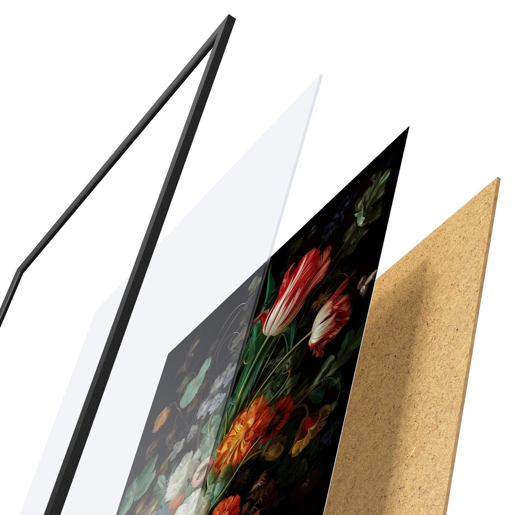 De poster bestaat uit een frame, plexiglas, geprinte afbeelding en spaanplaat achterkant. De poster kan meteen aan de muur worden gehangen dankzij de bevestigingen op de achterkant.