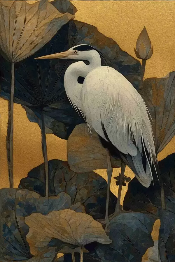 Poster Witte reiger tussen grote bladeren op een warme achtergrond f46147