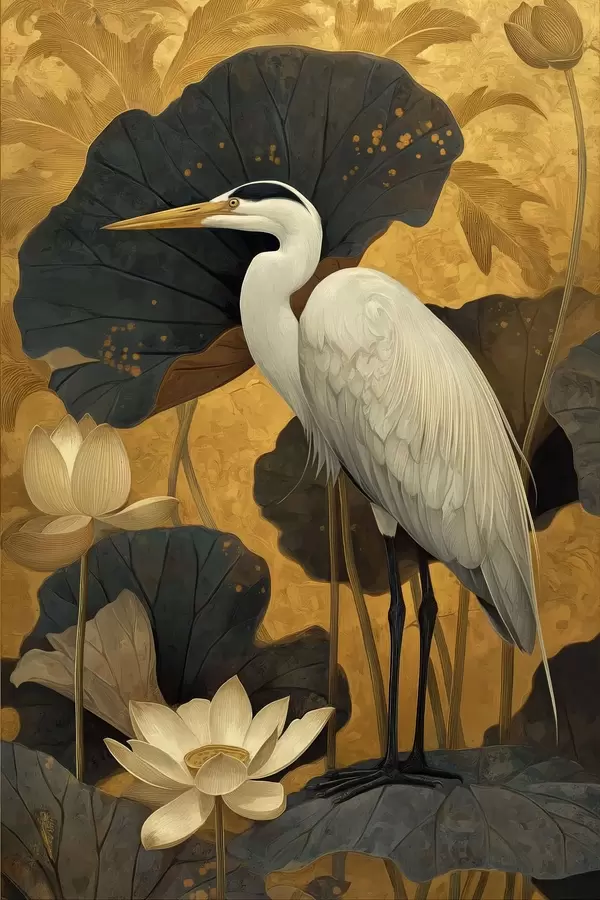 Poster Reiger tussen lotusbloemen op een warme achtergrond N° f46148