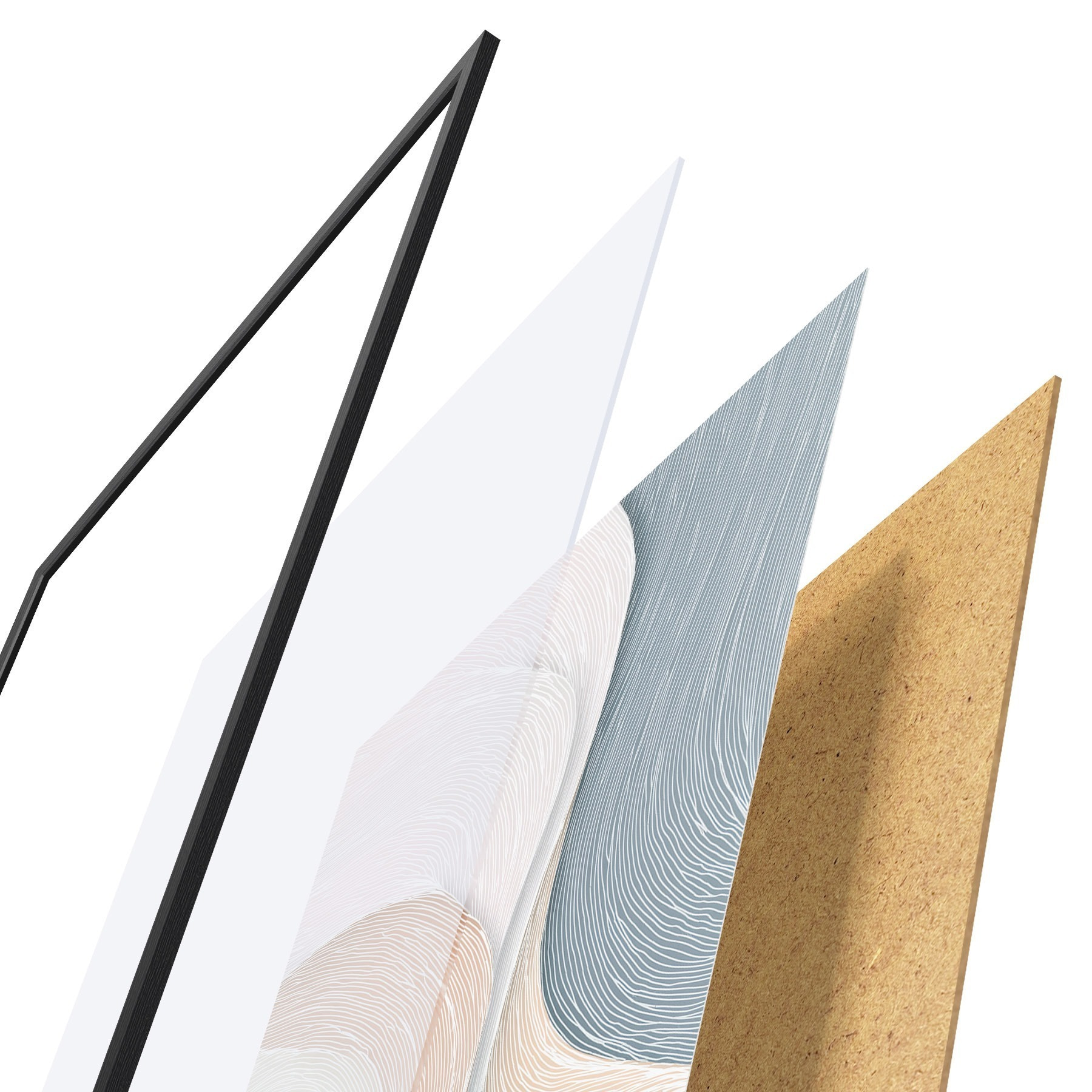De poster bestaat uit een frame, plexiglas, geprinte afbeelding en spaanplaat achterkant. De poster kan meteen aan de muur worden gehangen dankzij de bevestigingen op de achterkant.