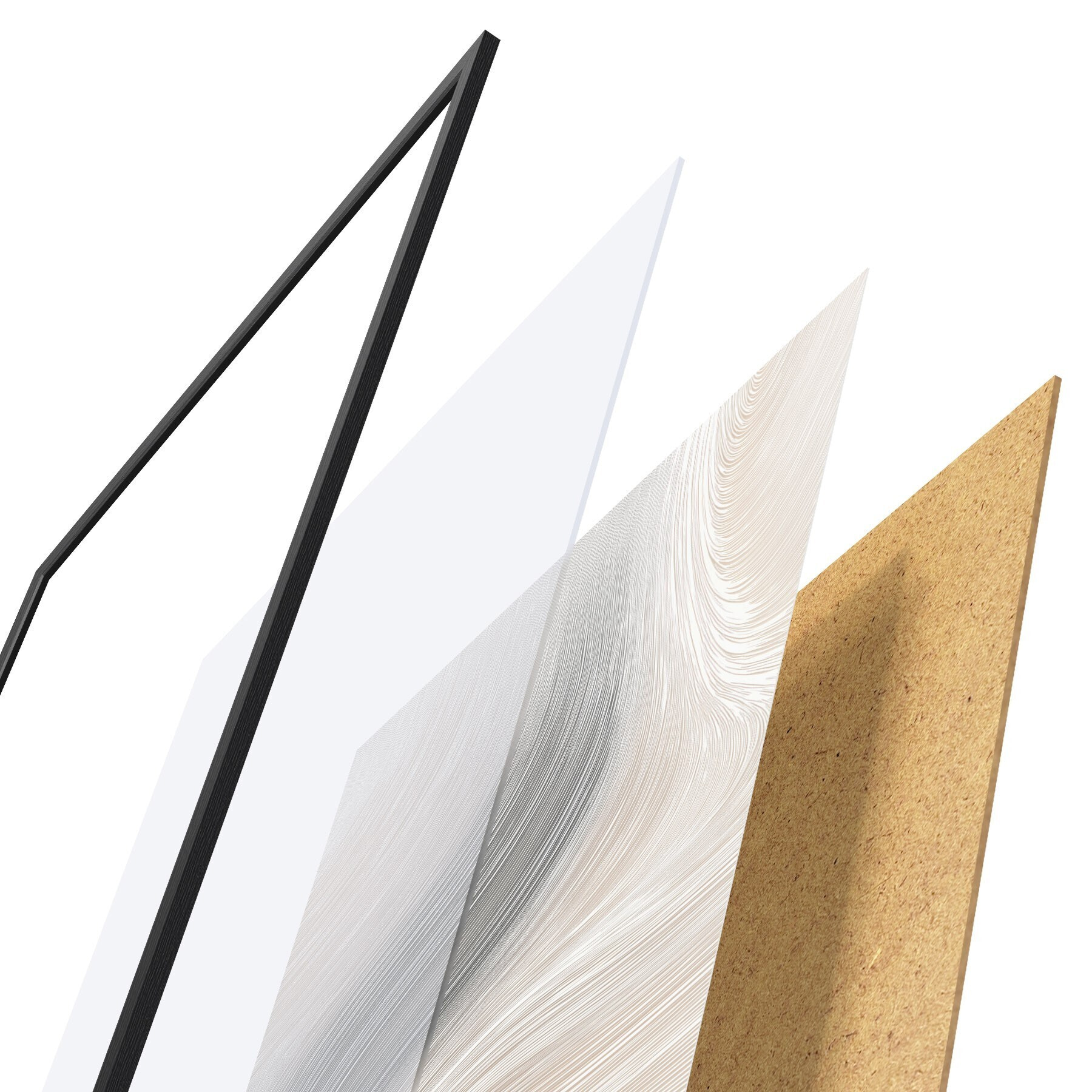 De poster bestaat uit een frame, plexiglas, geprinte afbeelding en spaanplaat achterkant. De poster kan meteen aan de muur worden gehangen dankzij de bevestigingen op de achterkant.