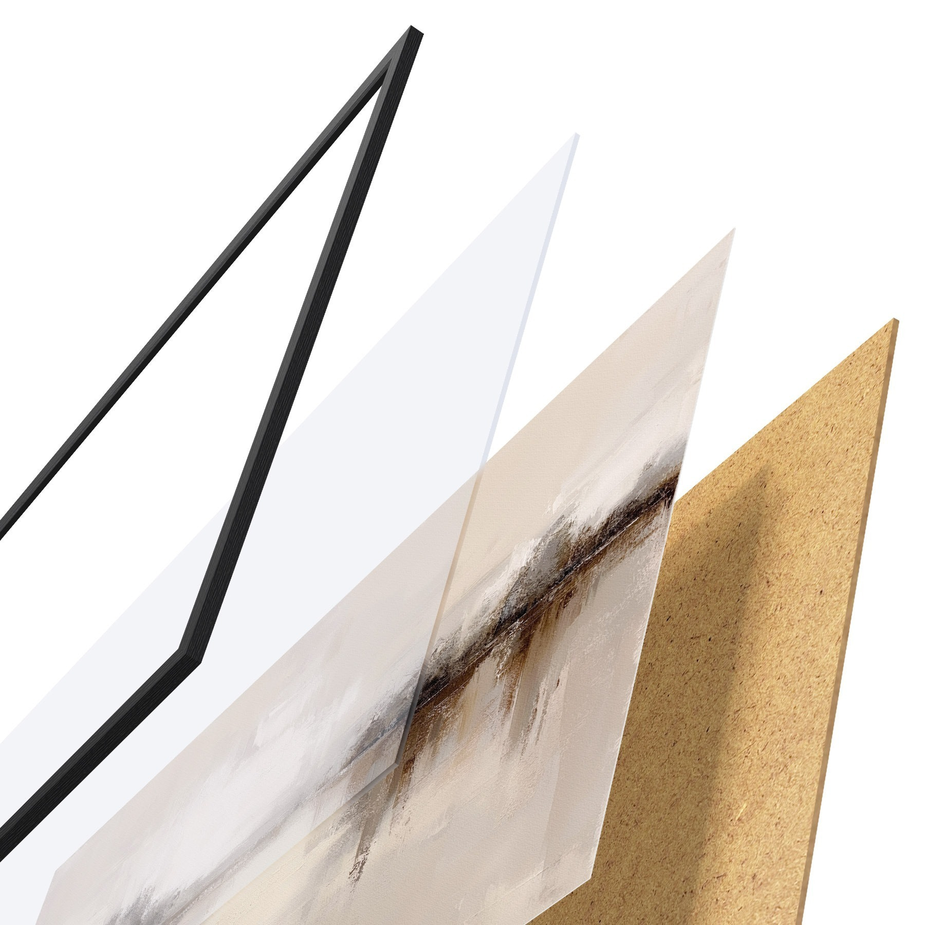 De poster bestaat uit een frame, plexiglas, geprinte afbeelding en spaanplaat achterkant. De poster kan meteen aan de muur worden gehangen dankzij de bevestigingen op de achterkant.