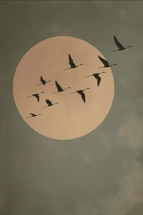 Poster Een zwerm vogels die tegen een grote warme maan vliegt N° f46162