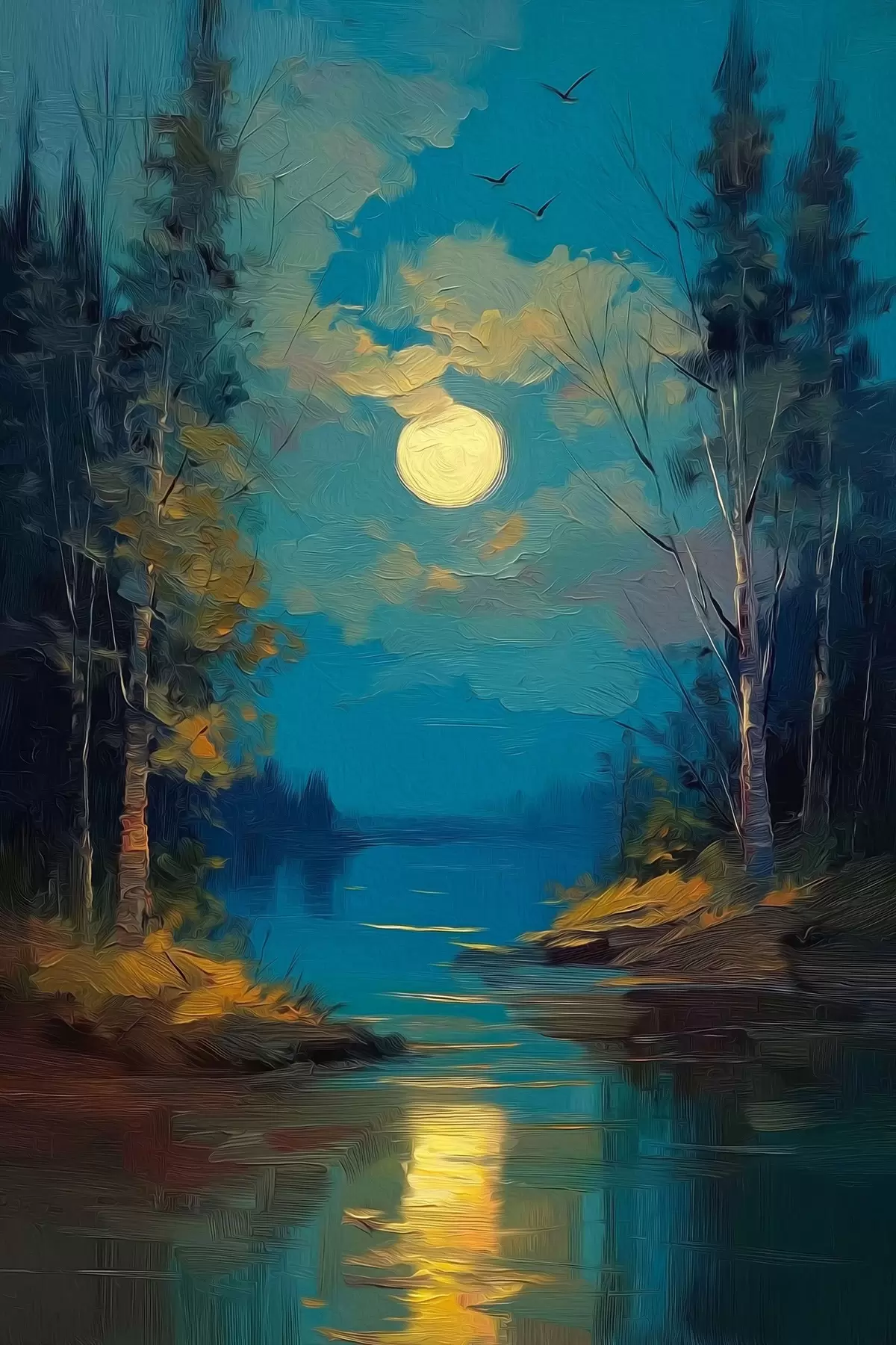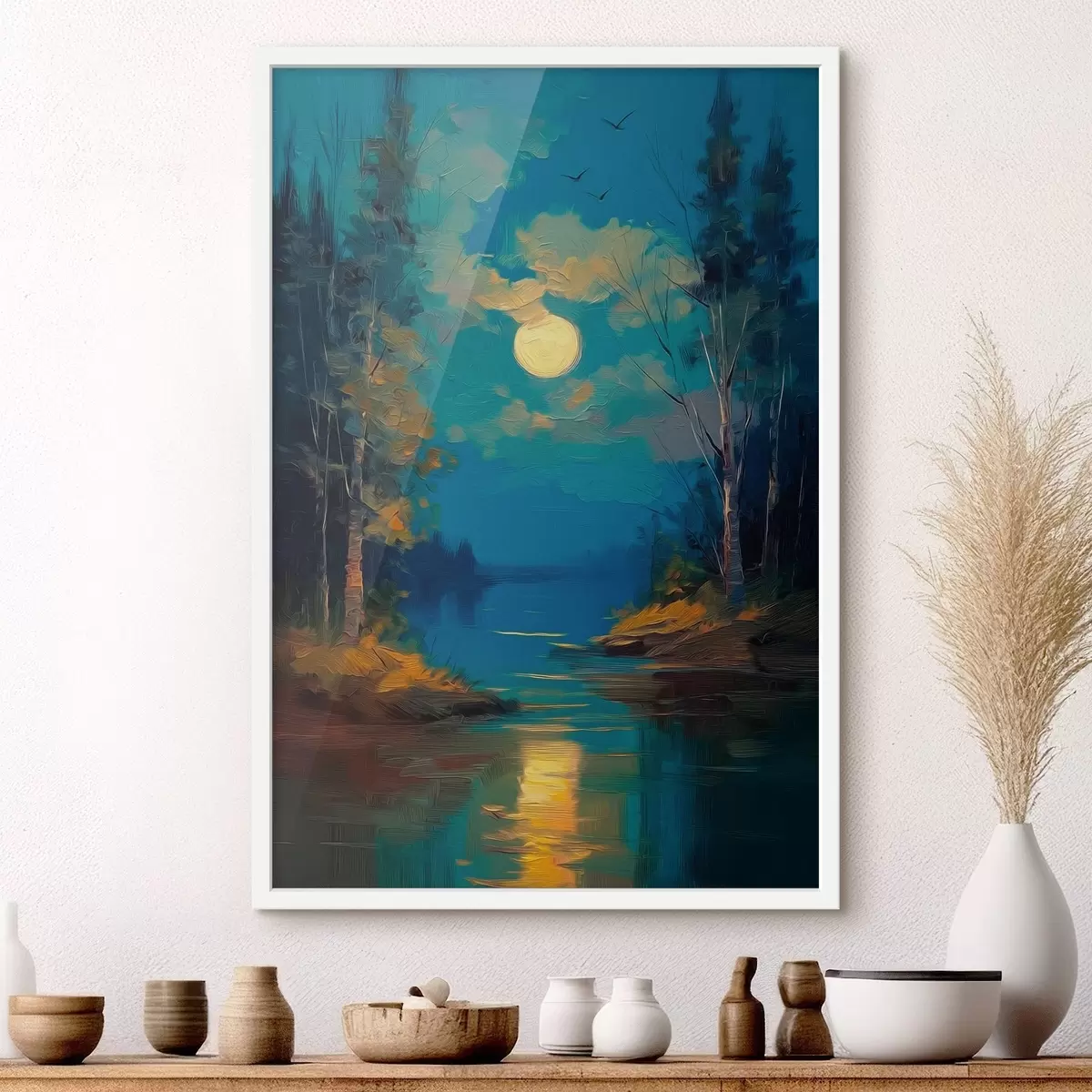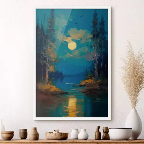 Poster Maanlicht boven een kalme rivier tussen dennenbomen N° f46164
