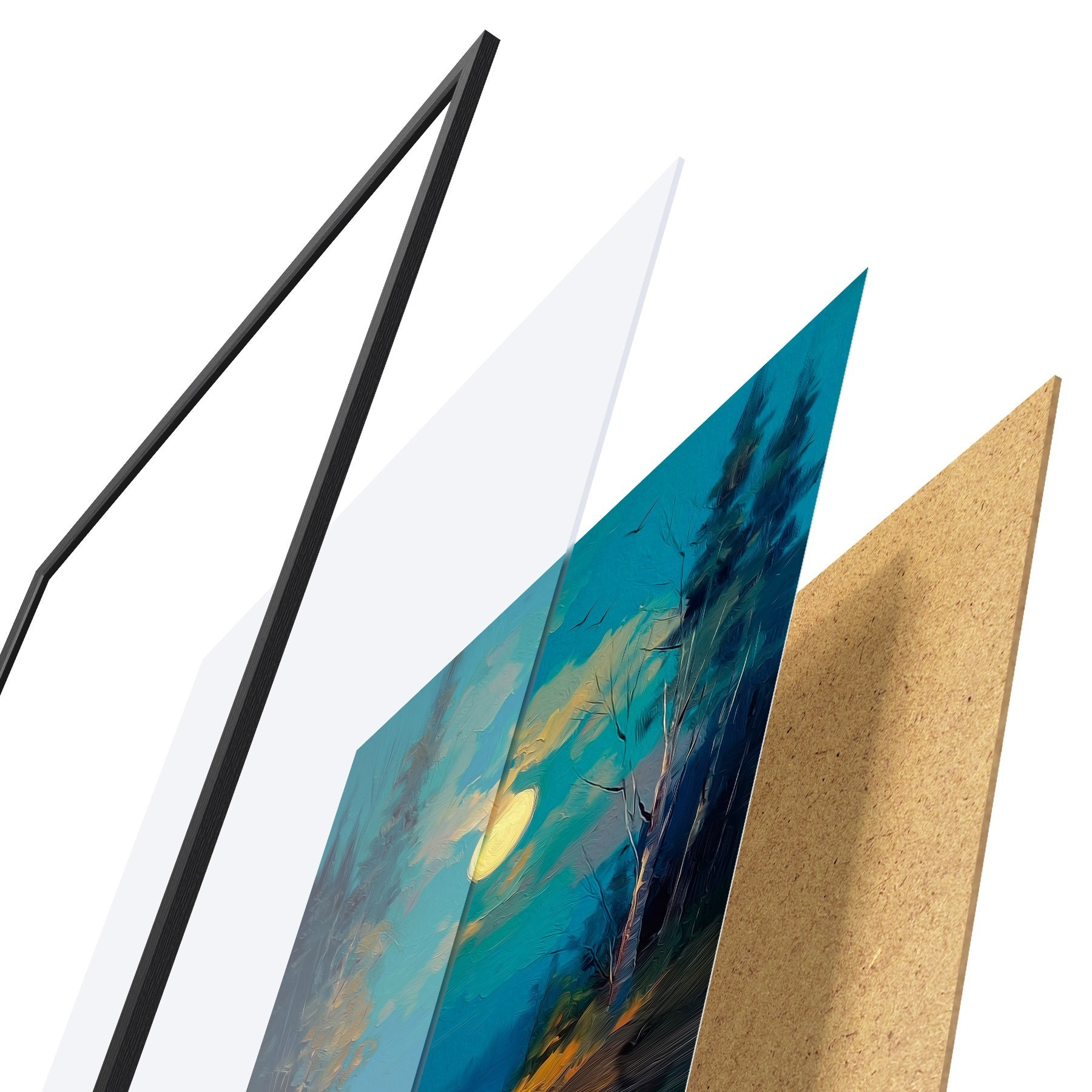De poster bestaat uit een frame, plexiglas, geprinte afbeelding en spaanplaat achterkant. De poster kan meteen aan de muur worden gehangen dankzij de bevestigingen op de achterkant.