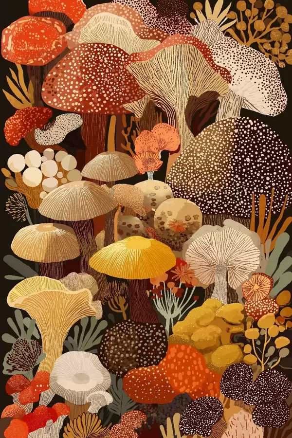 Poster Samenstelling van verschillende bospaddestoelen in warme tinten N° f46170