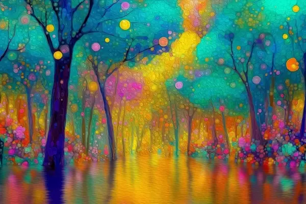 Poster Levendig fantasiebos met weerspiegelingen in het water N° f46171