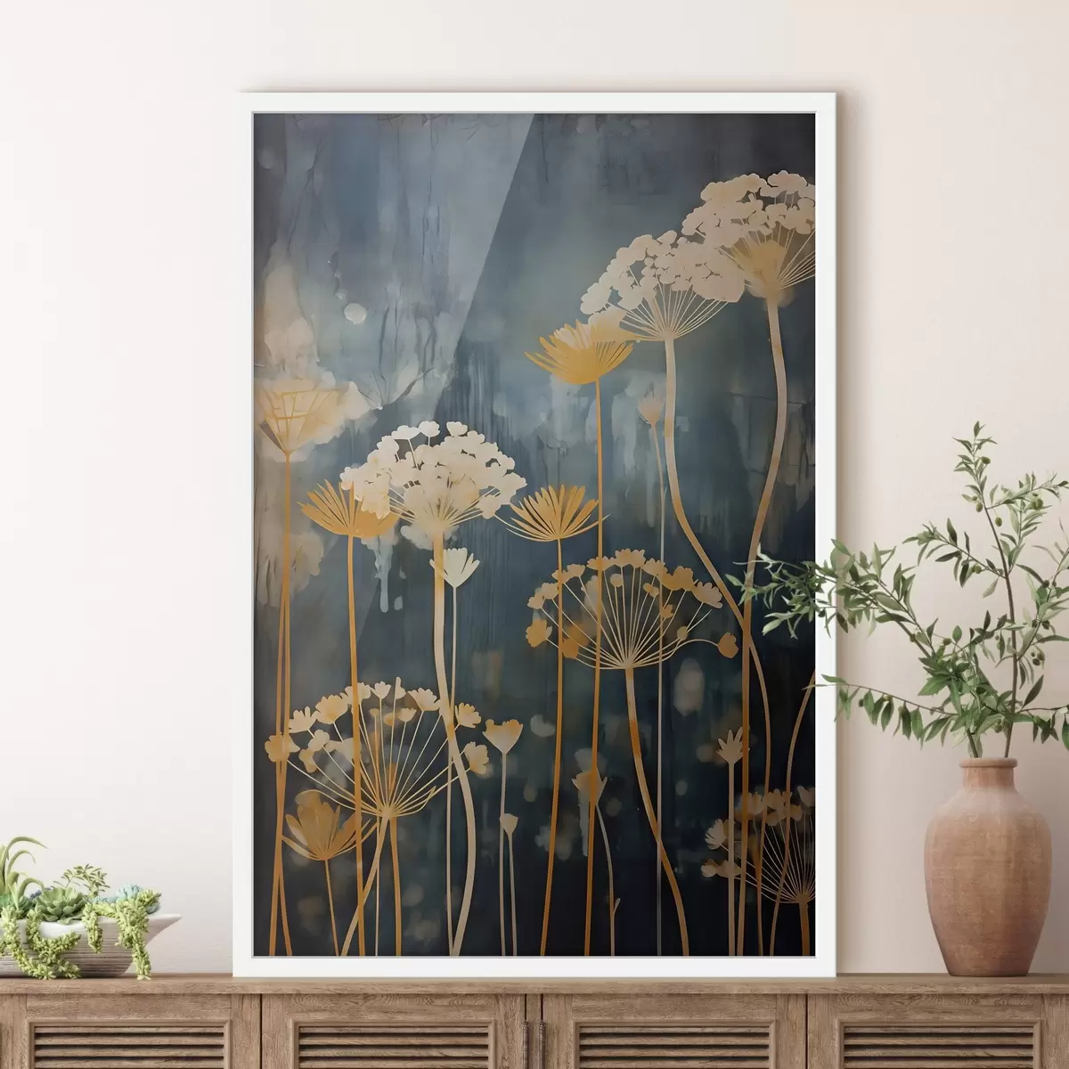 Poster Gestileerde bloemen met dunne stelen op een donkere achtergrond f46188