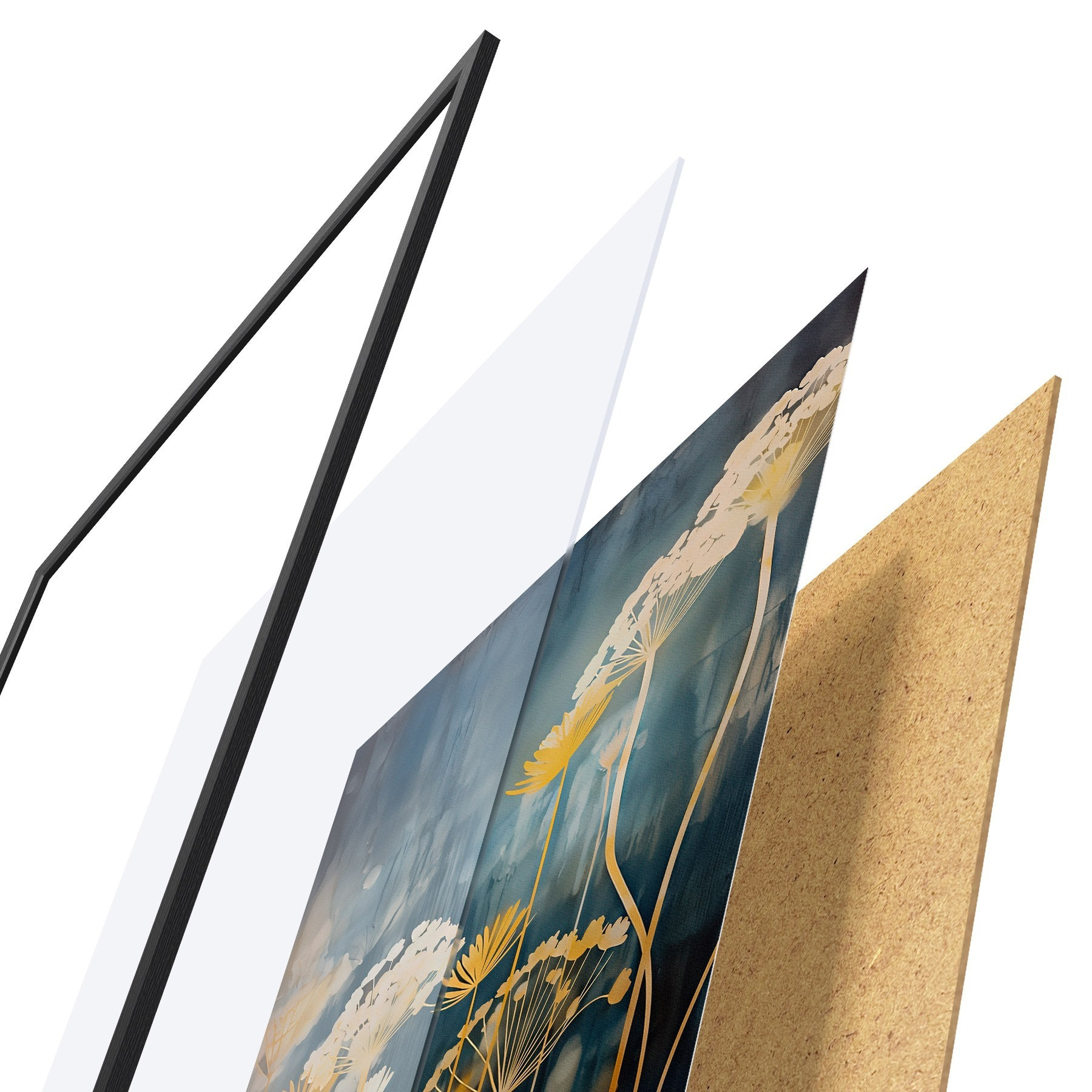 De poster bestaat uit een frame, plexiglas, geprinte afbeelding en spaanplaat achterkant. De poster kan meteen aan de muur worden gehangen dankzij de bevestigingen op de achterkant.