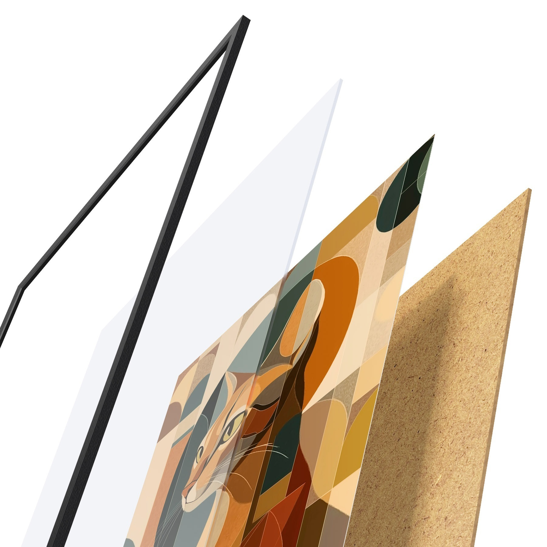 De poster bestaat uit een frame, plexiglas, geprinte afbeelding en spaanplaat achterkant. De poster kan meteen aan de muur worden gehangen dankzij de bevestigingen op de achterkant.