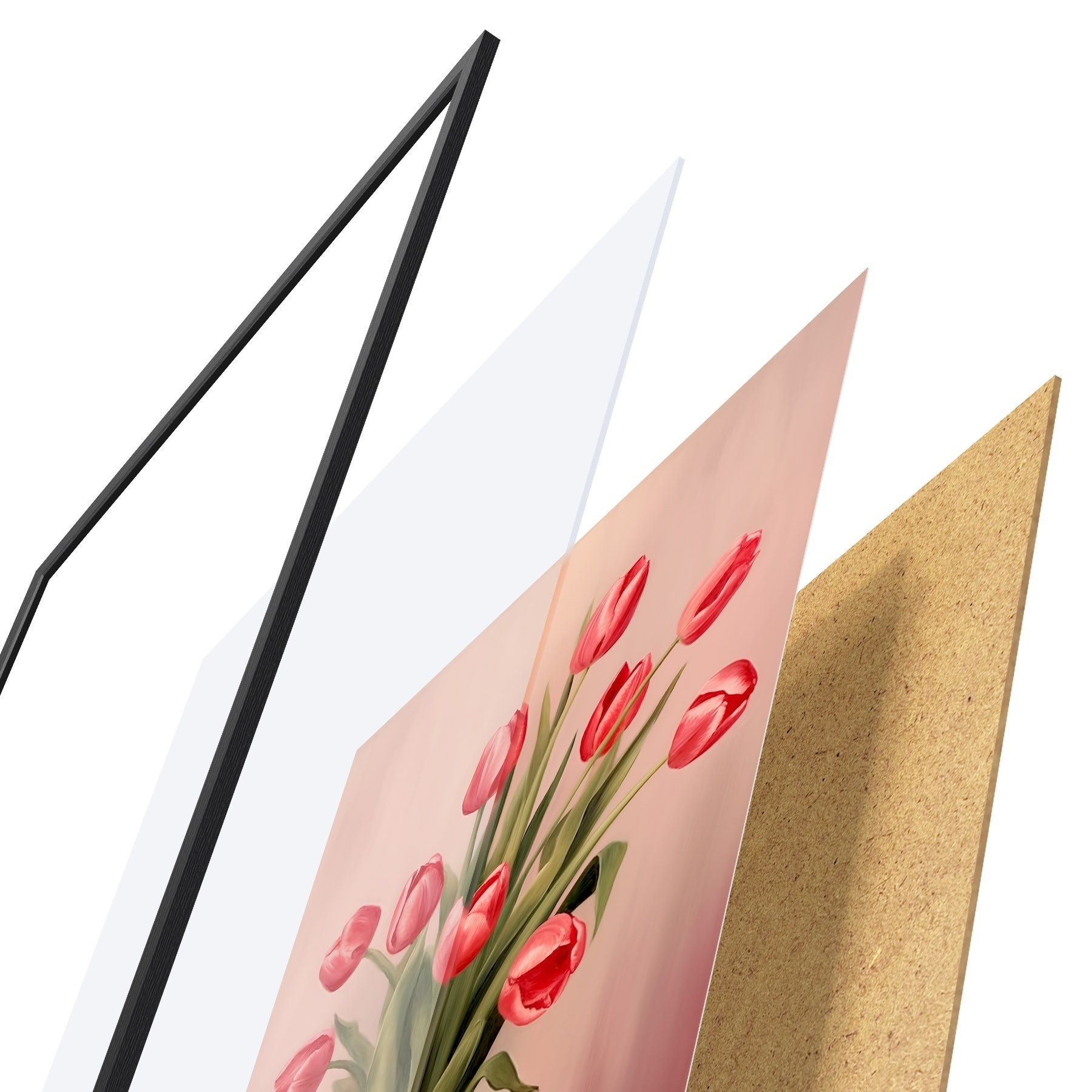 De poster bestaat uit een frame, plexiglas, geprinte afbeelding en spaanplaat achterkant. De poster kan meteen aan de muur worden gehangen dankzij de bevestigingen op de achterkant.