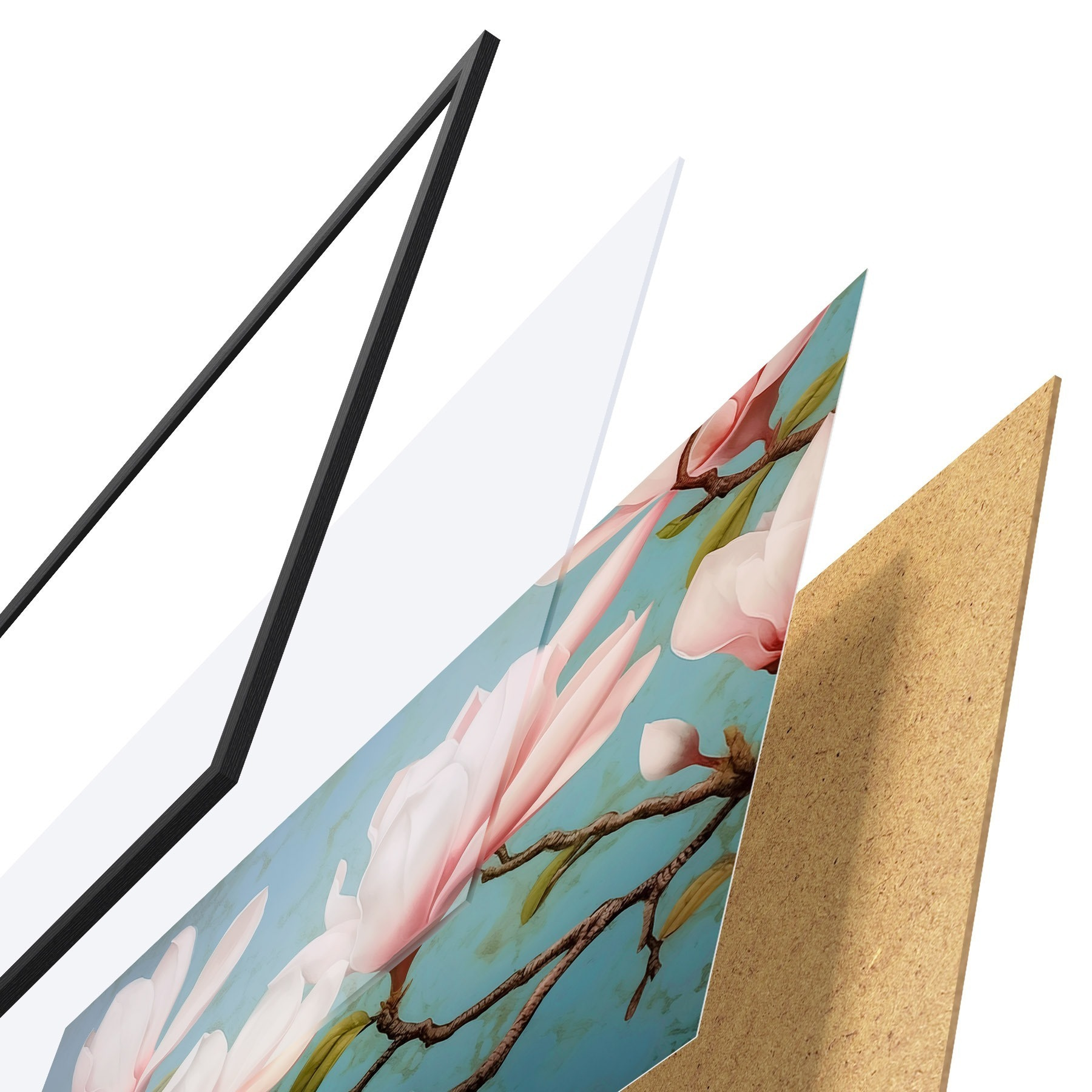 De poster bestaat uit een frame, plexiglas, geprinte afbeelding en spaanplaat achterkant. De poster kan meteen aan de muur worden gehangen dankzij de bevestigingen op de achterkant.