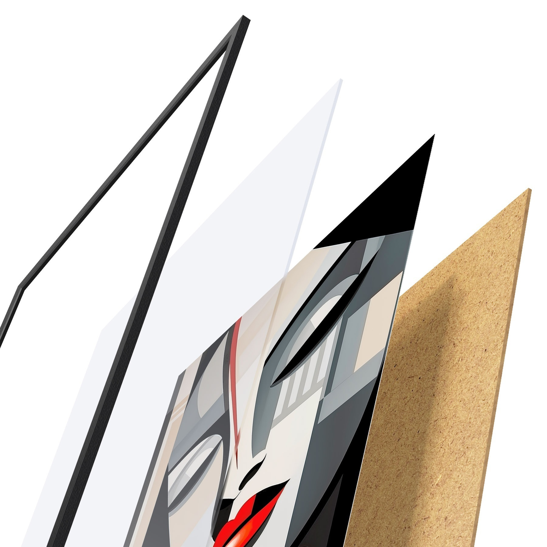 De poster bestaat uit een frame, plexiglas, geprinte afbeelding en spaanplaat achterkant. De poster kan meteen aan de muur worden gehangen dankzij de bevestigingen op de achterkant.