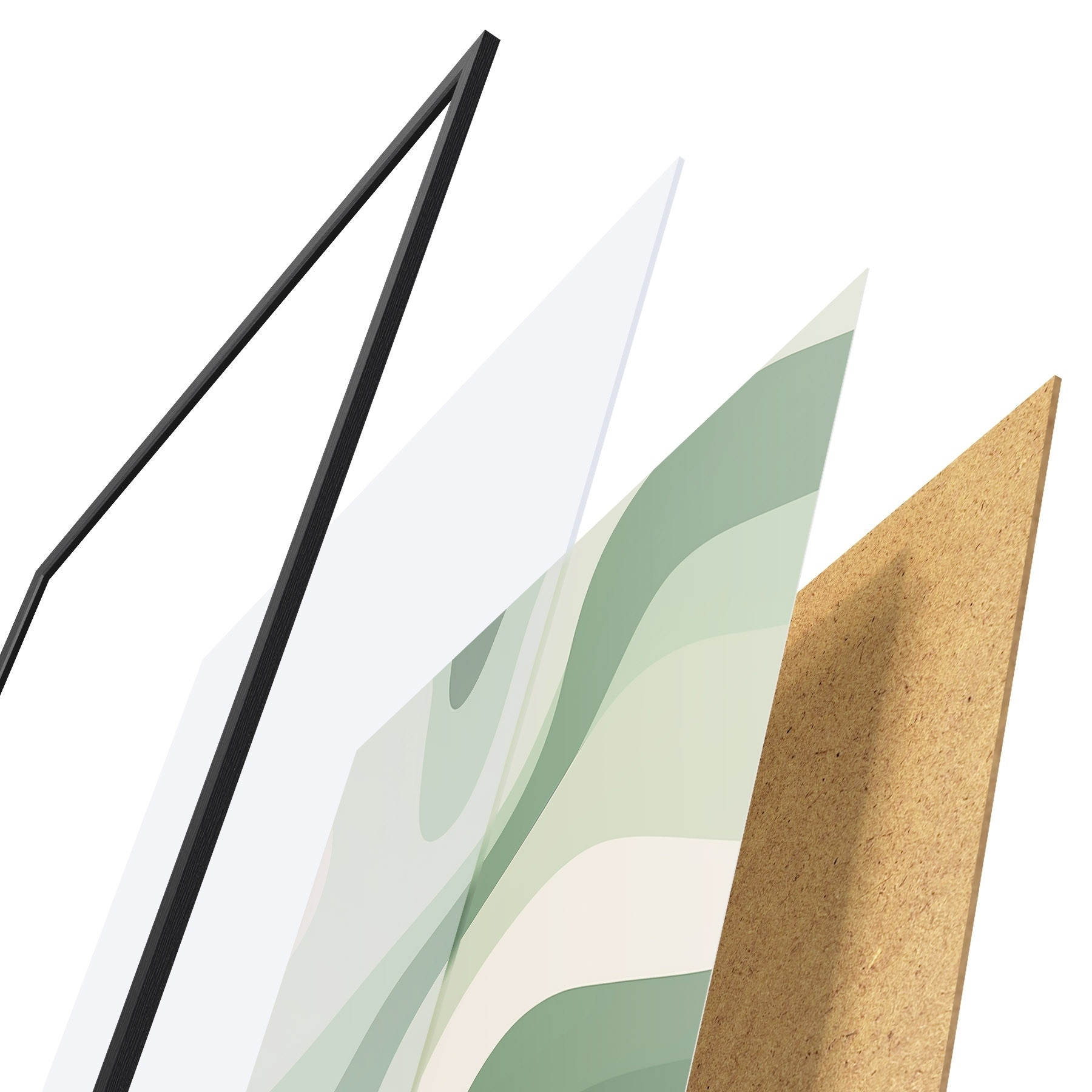 De poster bestaat uit een frame, plexiglas, geprinte afbeelding en spaanplaat achterkant. De poster kan meteen aan de muur worden gehangen dankzij de bevestigingen op de achterkant.