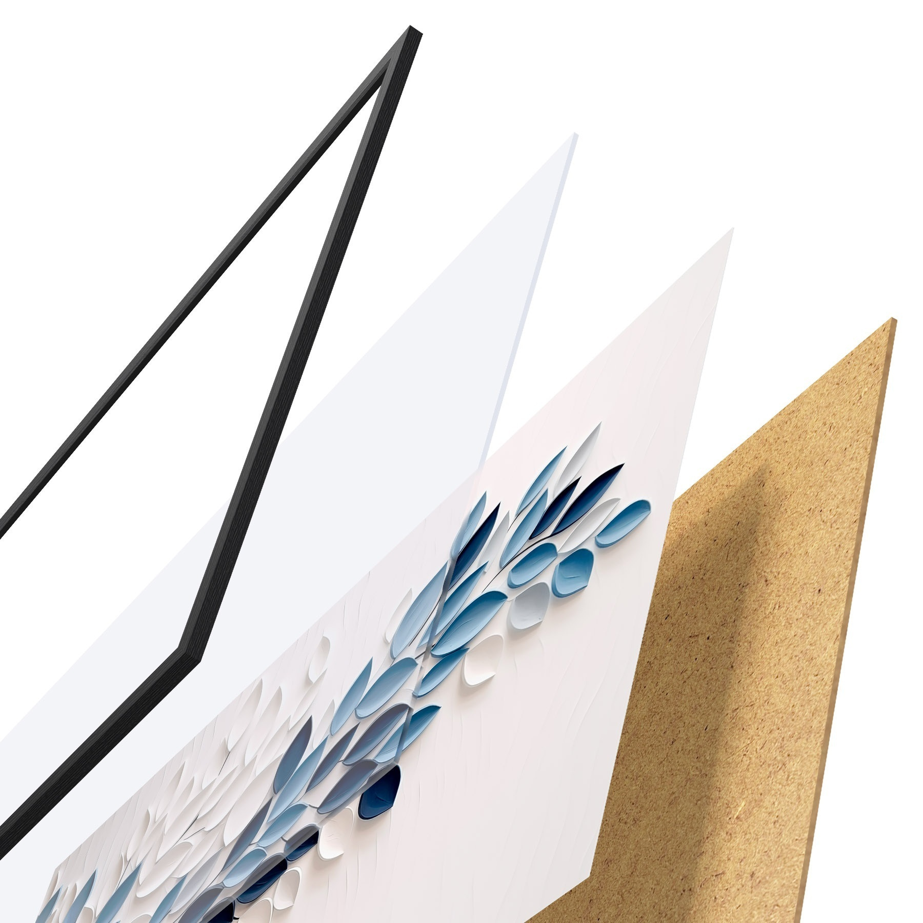 De poster bestaat uit een frame, plexiglas, geprinte afbeelding en spaanplaat achterkant. De poster kan meteen aan de muur worden gehangen dankzij de bevestigingen op de achterkant.
