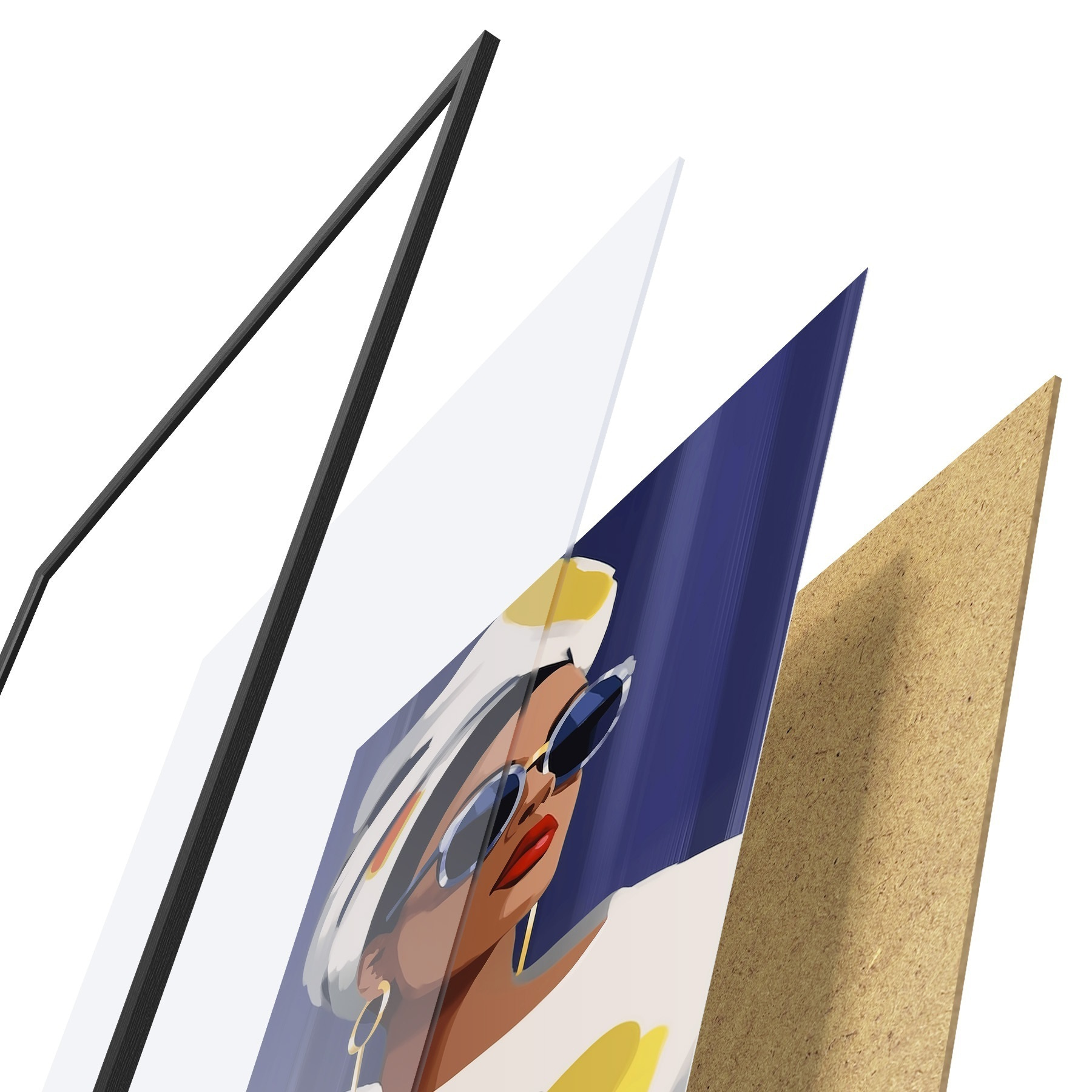 De poster bestaat uit een frame, plexiglas, geprinte afbeelding en spaanplaat achterkant. De poster kan meteen aan de muur worden gehangen dankzij de bevestigingen op de achterkant.