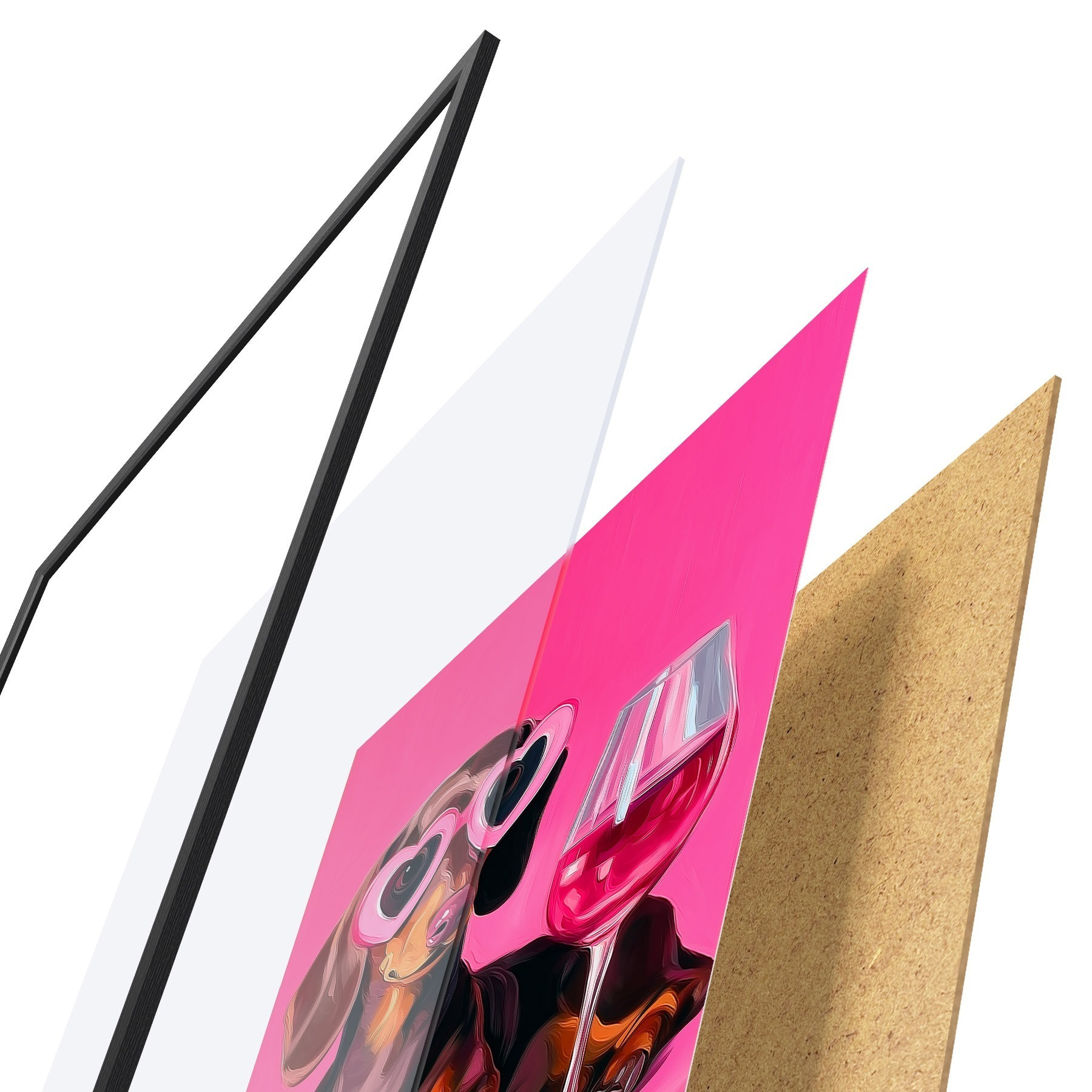 De poster bestaat uit een frame, plexiglas, geprinte afbeelding en spaanplaat achterkant. De poster kan meteen aan de muur worden gehangen dankzij de bevestigingen op de achterkant.