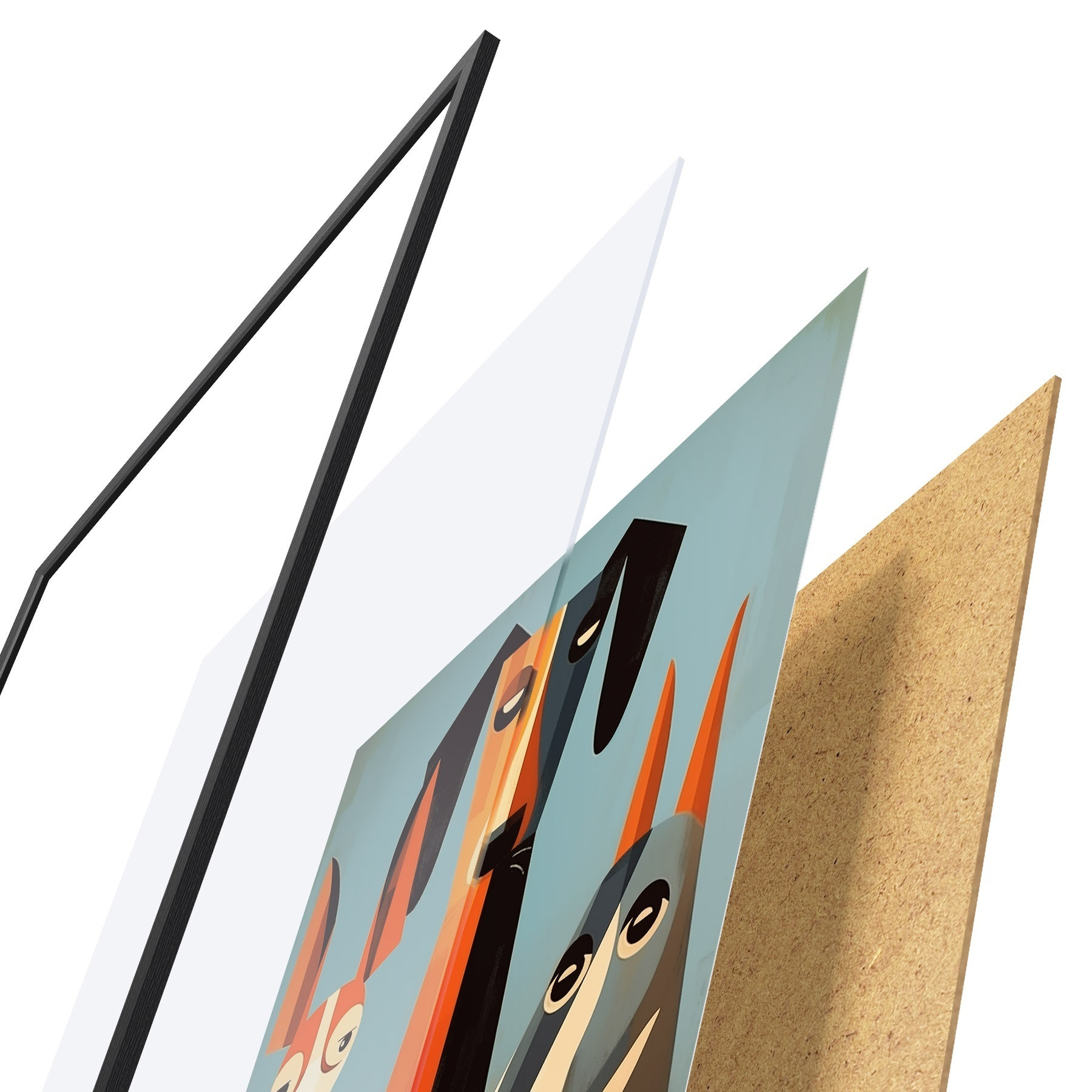 De poster bestaat uit een frame, plexiglas, geprinte afbeelding en spaanplaat achterkant. De poster kan meteen aan de muur worden gehangen dankzij de bevestigingen op de achterkant.