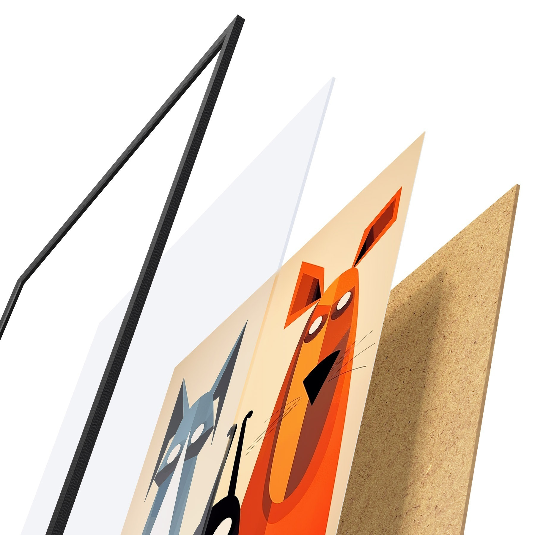 De poster bestaat uit een frame, plexiglas, geprinte afbeelding en spaanplaat achterkant. De poster kan meteen aan de muur worden gehangen dankzij de bevestigingen op de achterkant.