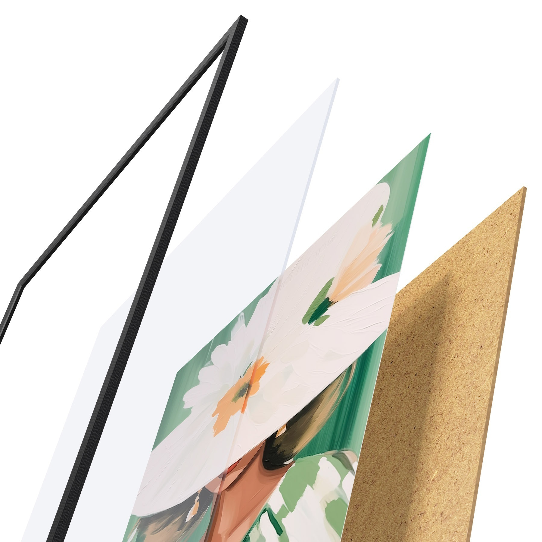 De poster bestaat uit een frame, plexiglas, geprinte afbeelding en spaanplaat achterkant. De poster kan meteen aan de muur worden gehangen dankzij de bevestigingen op de achterkant.