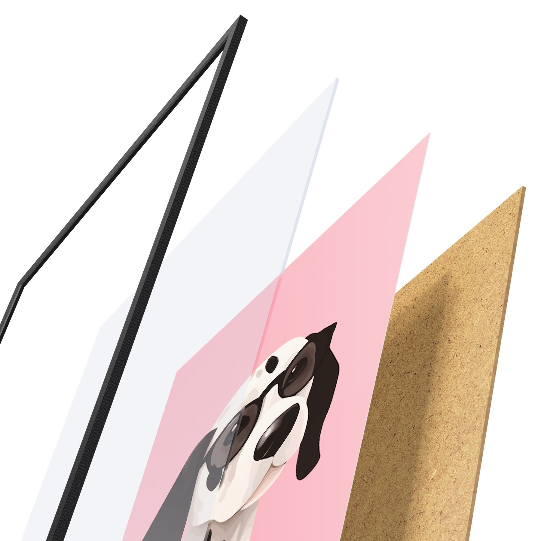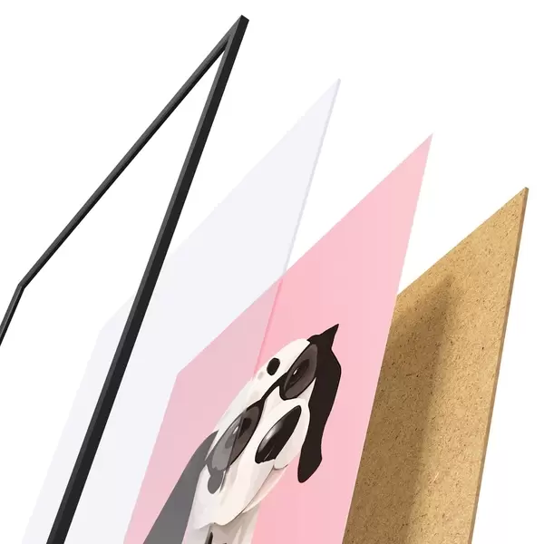 De poster bestaat uit een frame, plexiglas, geprinte afbeelding en spaanplaat achterkant. De poster kan meteen aan de muur worden gehangen dankzij de bevestigingen op de achterkant.