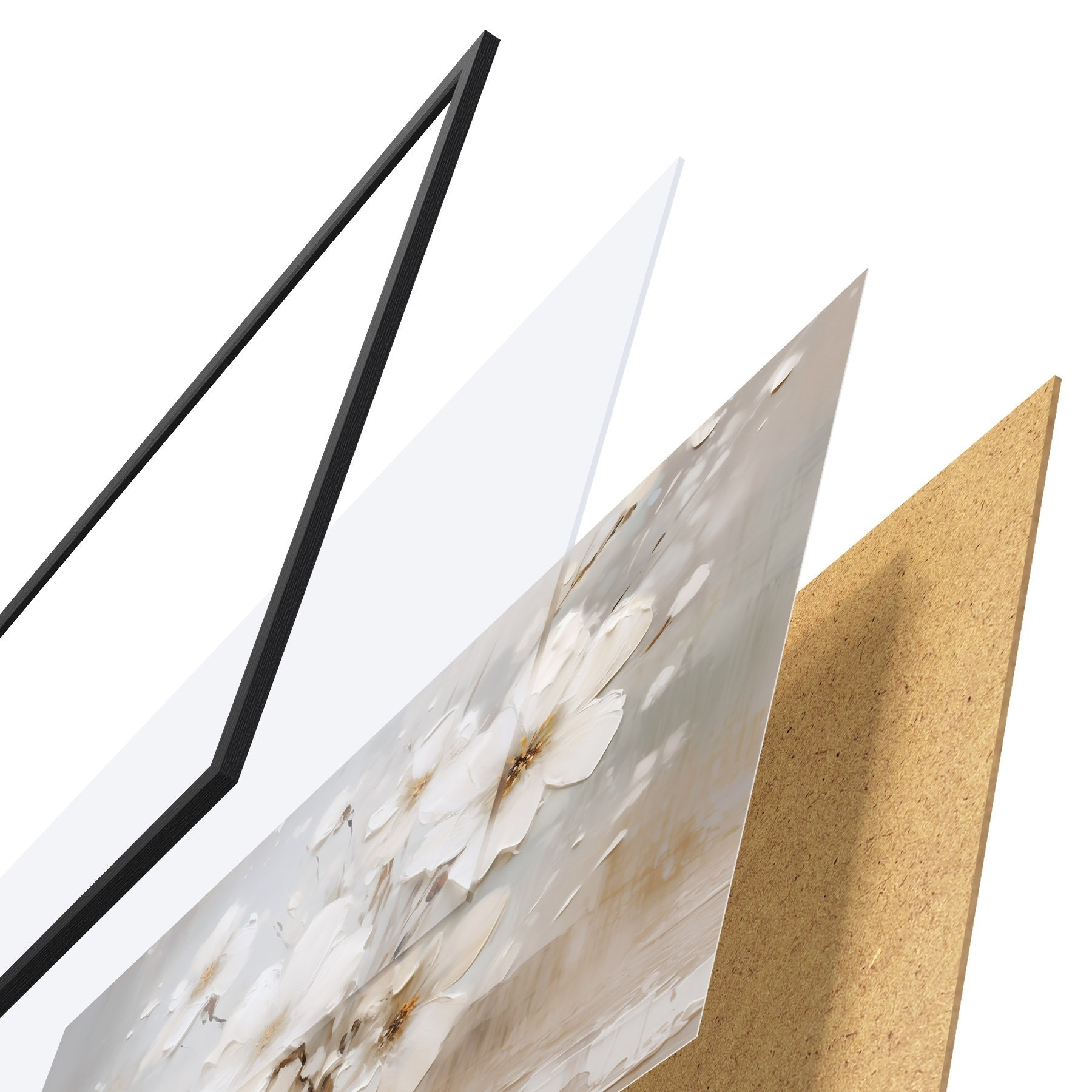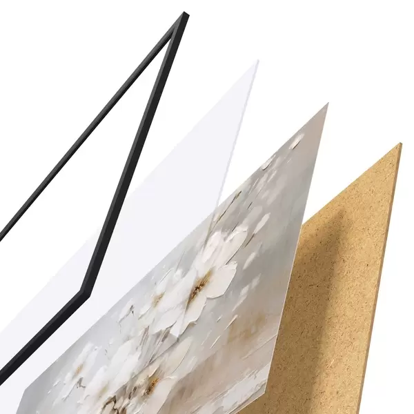 De poster bestaat uit een frame, plexiglas, geprinte afbeelding en spaanplaat achterkant. De poster kan meteen aan de muur worden gehangen dankzij de bevestigingen op de achterkant.