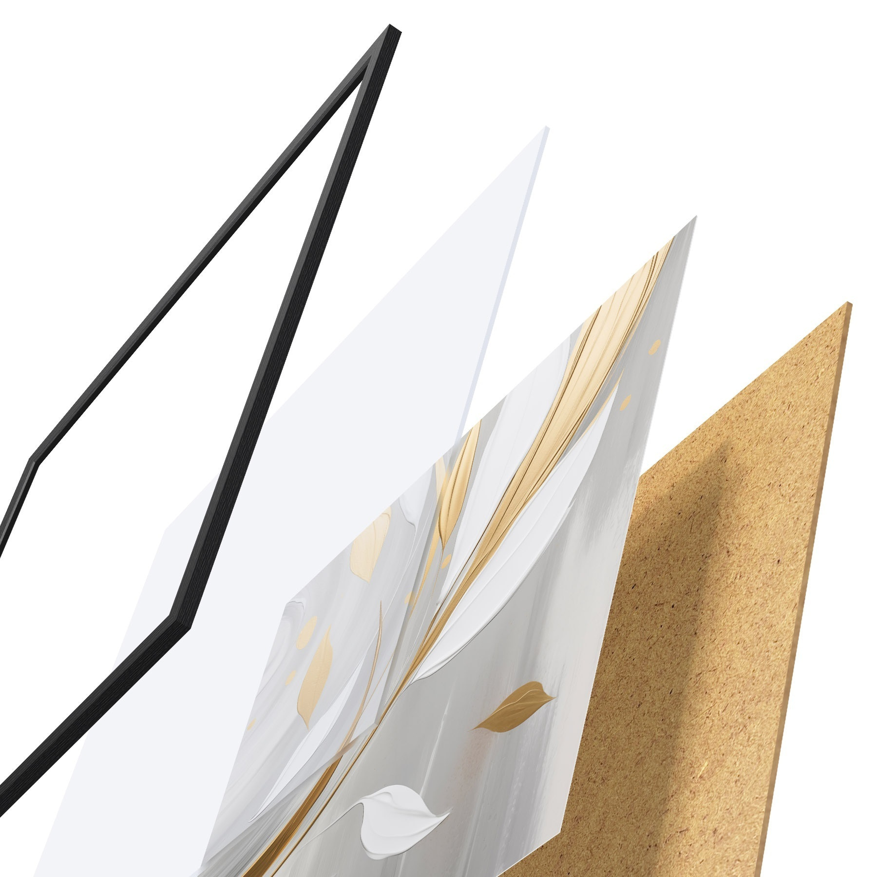 De poster bestaat uit een frame, plexiglas, geprinte afbeelding en spaanplaat achterkant. De poster kan meteen aan de muur worden gehangen dankzij de bevestigingen op de achterkant.
