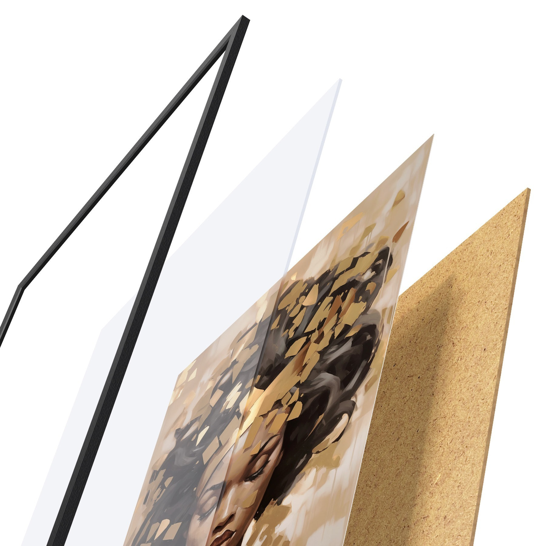 De poster bestaat uit een frame, plexiglas, geprinte afbeelding en spaanplaat achterkant. De poster kan meteen aan de muur worden gehangen dankzij de bevestigingen op de achterkant.
