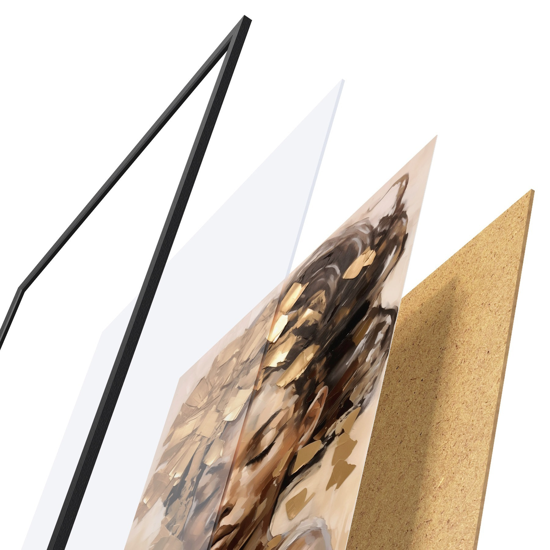 De poster bestaat uit een frame, plexiglas, geprinte afbeelding en spaanplaat achterkant. De poster kan meteen aan de muur worden gehangen dankzij de bevestigingen op de achterkant.