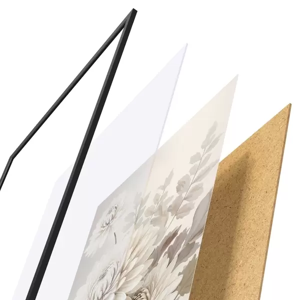 De poster bestaat uit een frame, plexiglas, geprinte afbeelding en spaanplaat achterkant. De poster kan meteen aan de muur worden gehangen dankzij de bevestigingen op de achterkant.