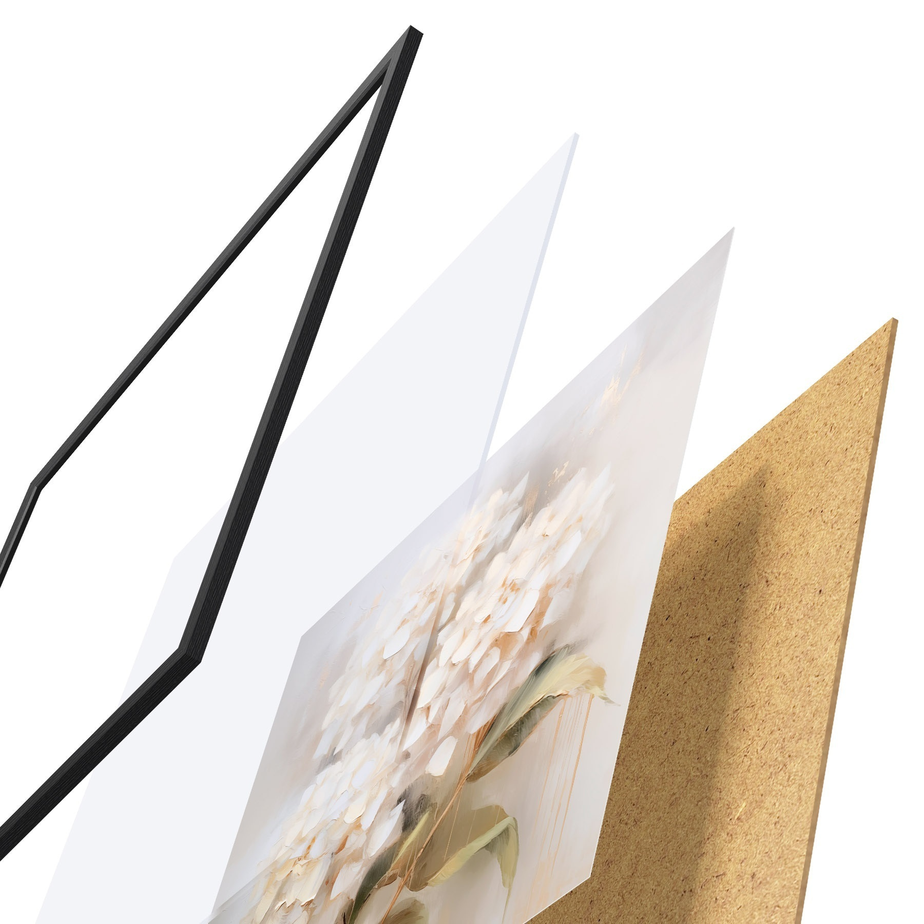 De poster bestaat uit een frame, plexiglas, geprinte afbeelding en spaanplaat achterkant. De poster kan meteen aan de muur worden gehangen dankzij de bevestigingen op de achterkant.