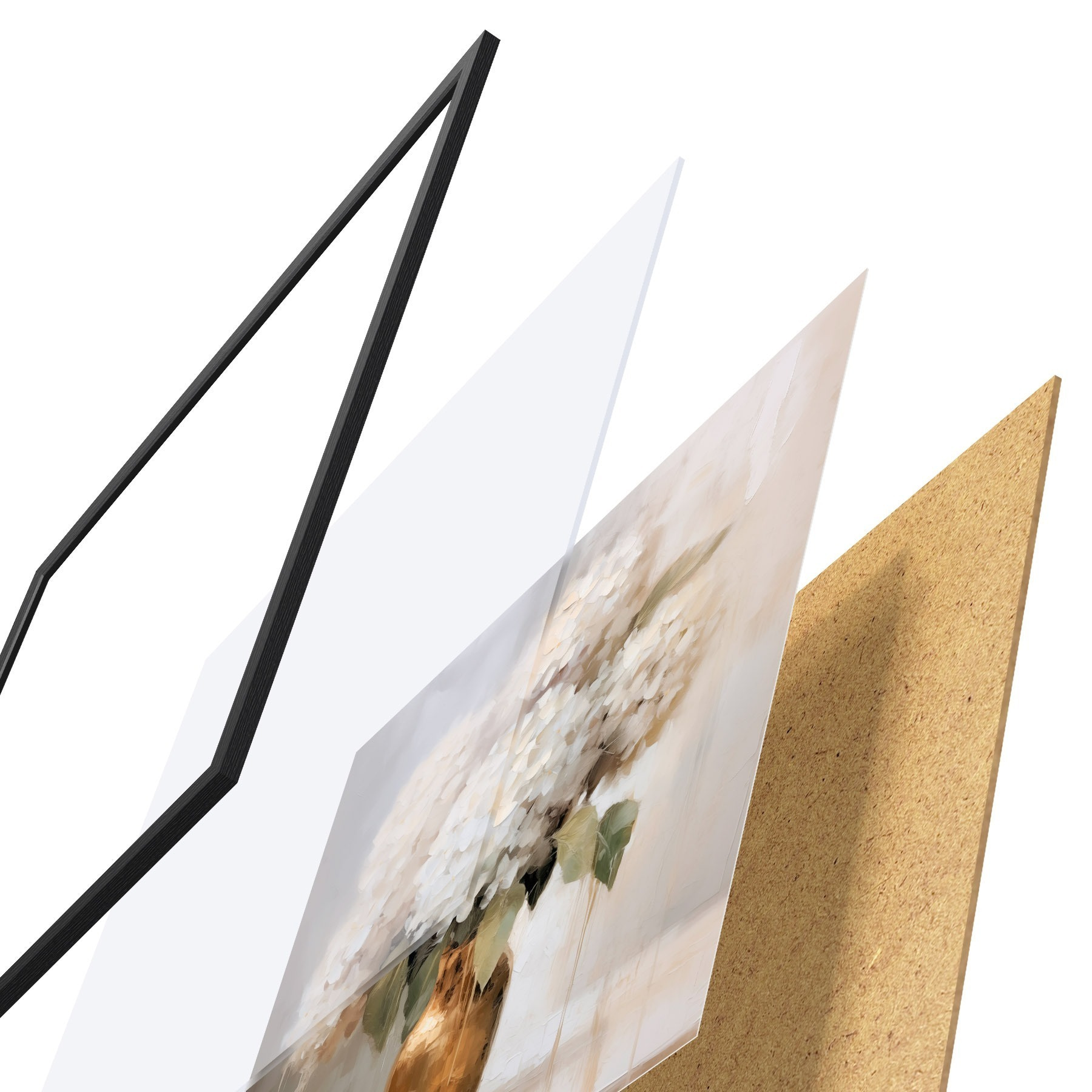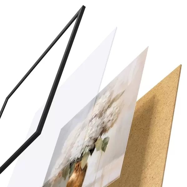 De poster bestaat uit een frame, plexiglas, geprinte afbeelding en spaanplaat achterkant. De poster kan meteen aan de muur worden gehangen dankzij de bevestigingen op de achterkant.