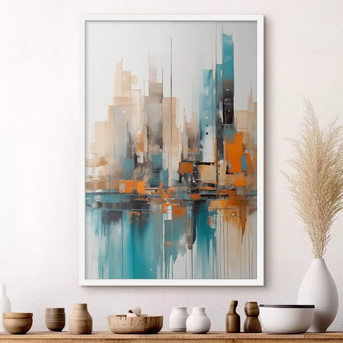 Poster Abstract stadsgezicht met oranje, blauwgroene en bruine verticale penseelstreken en geometrische vormen f46266