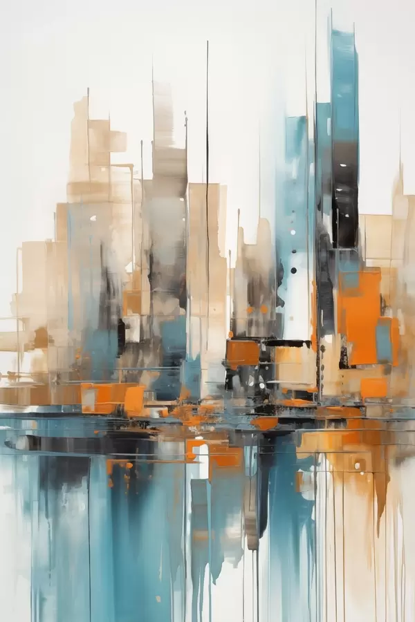 Poster Abstract stadsgezicht met oranje, blauwgroene en bruine verticale penseelstreken en geometrische vormen f46266