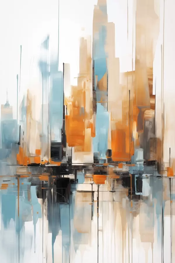 Poster Abstract stadsgezicht met verticale penseelstreken in tinten oranje, blauw en wit, schilderstijl N° f46267