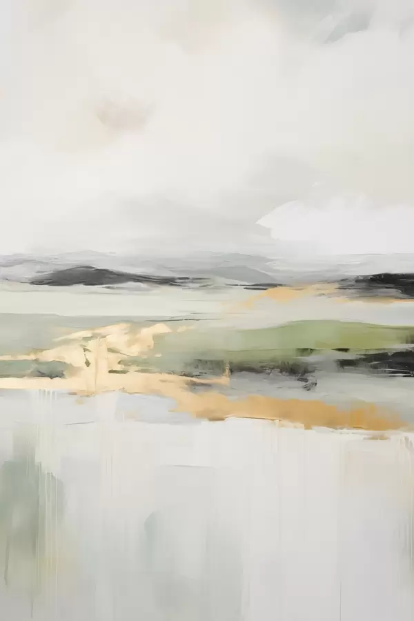 Poster Abstract landschap met gele accenten, een minimalistische compositie van land, water en lucht, met gedempte kleuren f46269