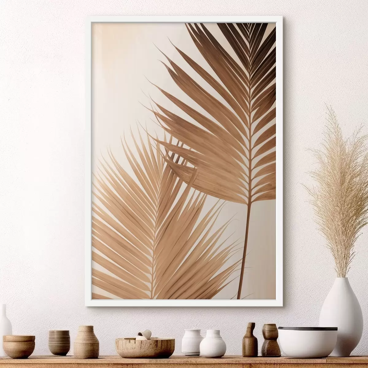 Poster Palmbladeren in bruine tinten, neutrale achtergrond, minimalistische stijl, natuurlijke belichting, tropische sfeer f46274