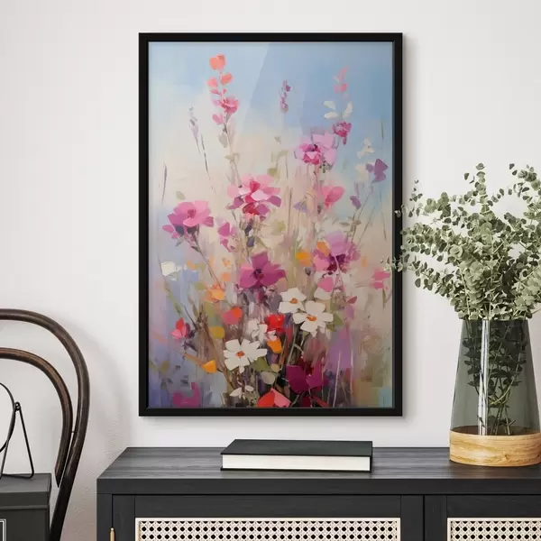 Poster Levendige roze, witte en groene bloemen tegen een zachte, pastelkleurige achtergrond f46278