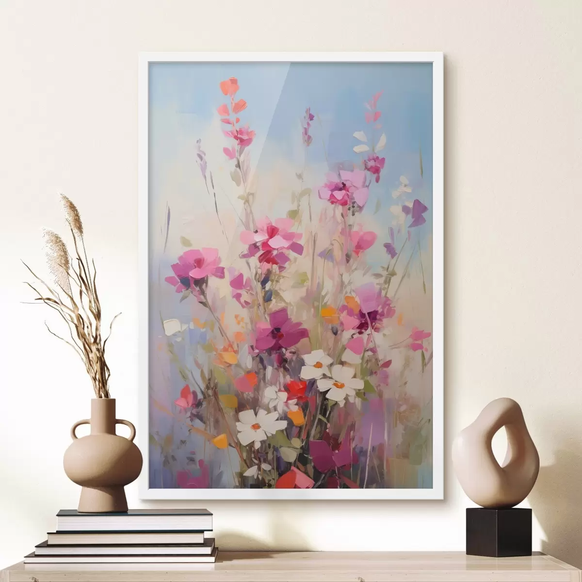 Poster Levendige roze, witte en groene bloemen tegen een zachte, pastelkleurige achtergrond N° f46278