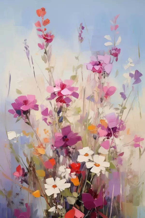 Poster Levendige roze, witte en groene bloemen tegen een zachte, pastelkleurige achtergrond f46278