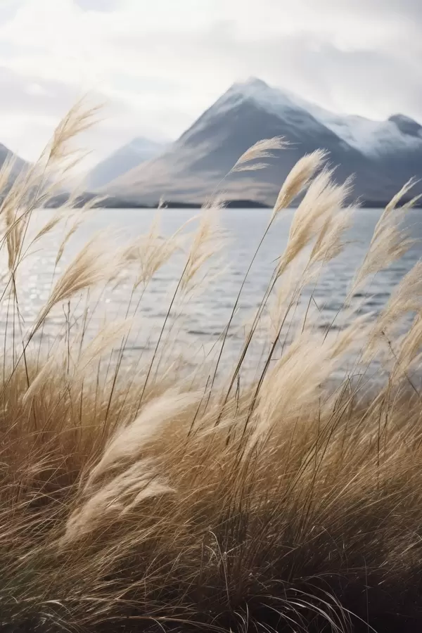 Poster Pampagras met een meer en bergen op de achtergrond, zachte belichting, gedempte kleuren, naturalistische stijl N° f46283