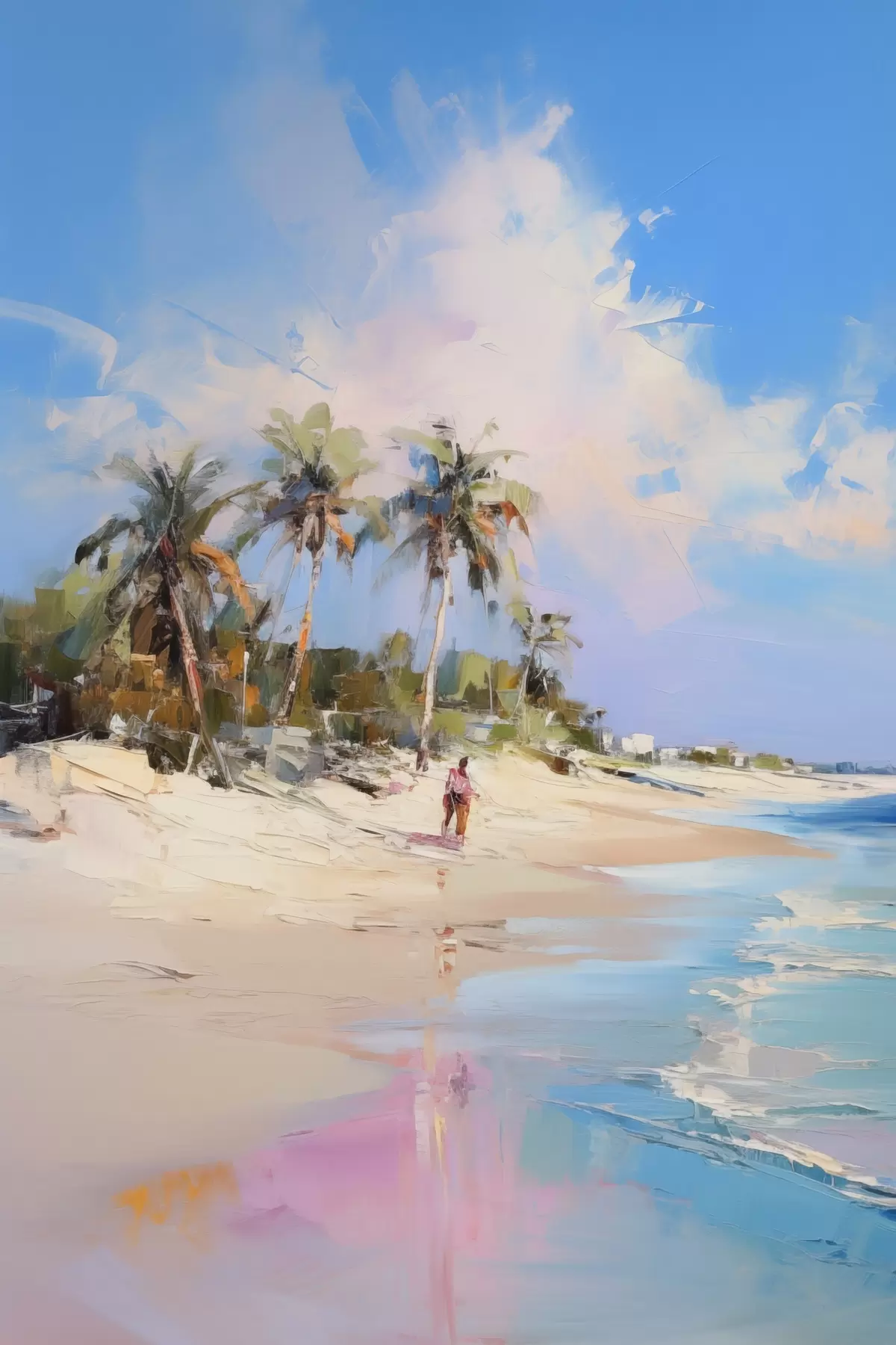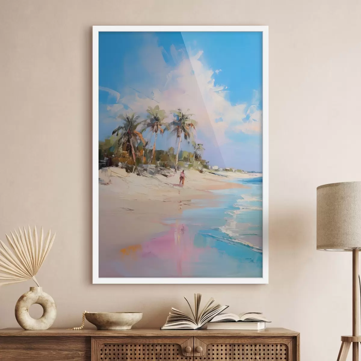 Poster Abstract landschap, een strand met palmbomen, heldere zonnige dag met een blauwe lucht en enkele wolken N° f46284