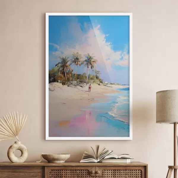 Poster Abstract landschap, een strand met palmbomen, heldere zonnige dag met een blauwe lucht en enkele wolken f46284
